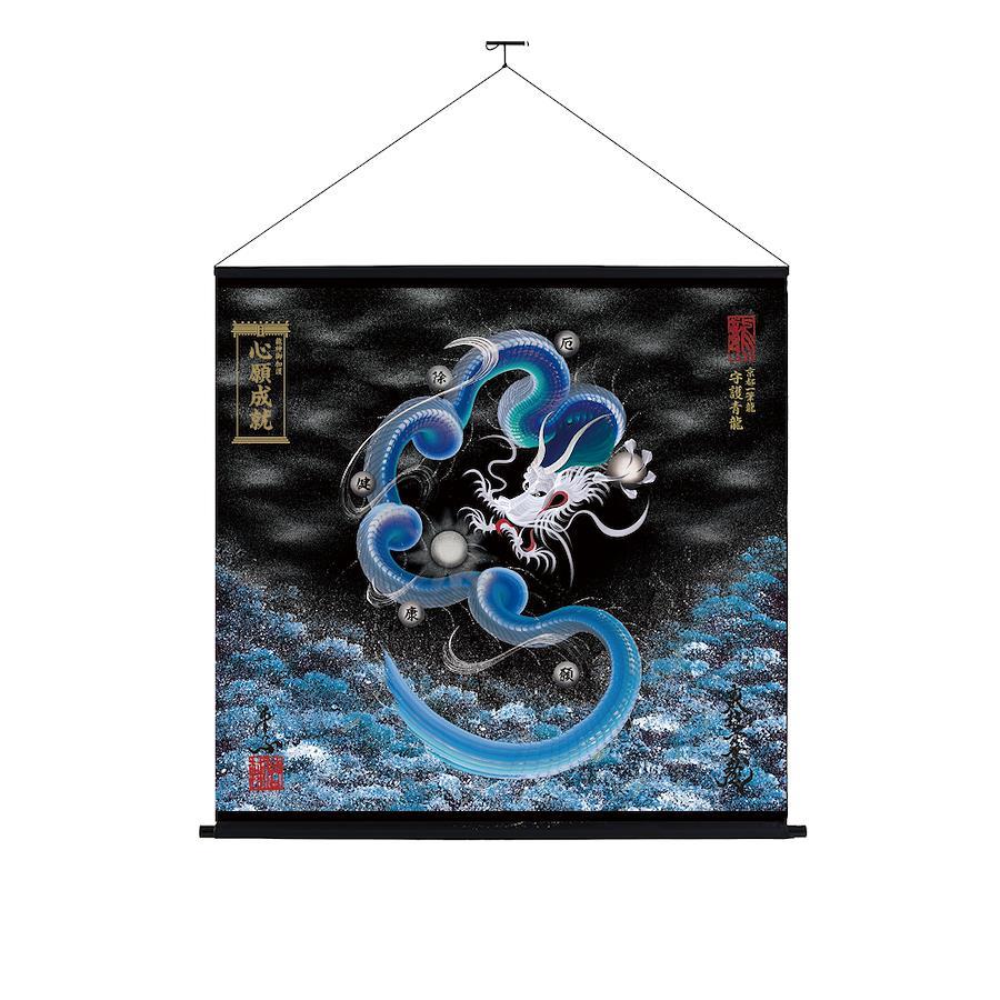 【商品の特徴】・京都一筆龍描画の種類/色彩は【26種】よりお選びいただけます<昇運龍14種(双龍5種/1体龍9種)> <守護龍10種(双龍2種/1体龍8種)> <縁結び龍2種(双龍2種)>・『京都一筆龍の御加護/御利益の象徴=胴体部分を一切途切れさせず一筆で描く動画』のQRコード印字ステッカー(2色/4サイズ)を同封お納めいたしております・描画に記載可能なお願い事は6種のご祈願内容より御選定いただけます心願成就/事業繁栄/金運上昇/健康祈願/家内安全/良縁成就・御札など添付のお祀り用マグネットを使用してお祀り(取り外し/位置変更可能)・発色が良く落ち着いた風合いの防炎スエード生地製(厚み約0.35~ ※官製郵便はがき約1.5枚程度/コピー用紙約4枚分程度)※ スエードは皮革・合成皮革ではなく専用布の名称となります。・吊り下げ用の上下軸棒付き(下部は軸先付き)※軸棒を外して飾られる場合でも、紐や止め具(画鋲、釘、ネジ等)をお使いいただけるハトメ穴付き(表面からは見えません)・丈夫で切れにくくシンプルな風合いの江戸打ち紐付き(黒/白2色)・龍の眼に光を宿し生気を吹き込む『龍の瞳(ラインストーン)』加工・京都一筆龍絵師手島啓輔署名、落款入り・御贈答のご利用も多く、懇切丁寧な包装