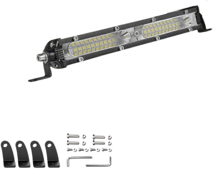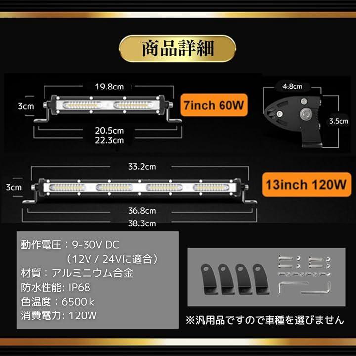 「仕様」サイズ(約):60w 20cmx5cmx3cm / 素材:アルミニウム合金製(本体) / 動作電圧: 9-30V DC(12V / 24Vに適合) / 消費電力: 60W 120W/1個 / 防水性能: IP68 / ルーメン:8000LM 12000LM/1個 / 色温度: 6500K / LEDバルブ寿命: 30000時間以上 / 作業温度: -40°~ 85° / セット内容: LEDライト1個(取付ネジ1式)