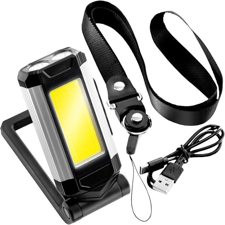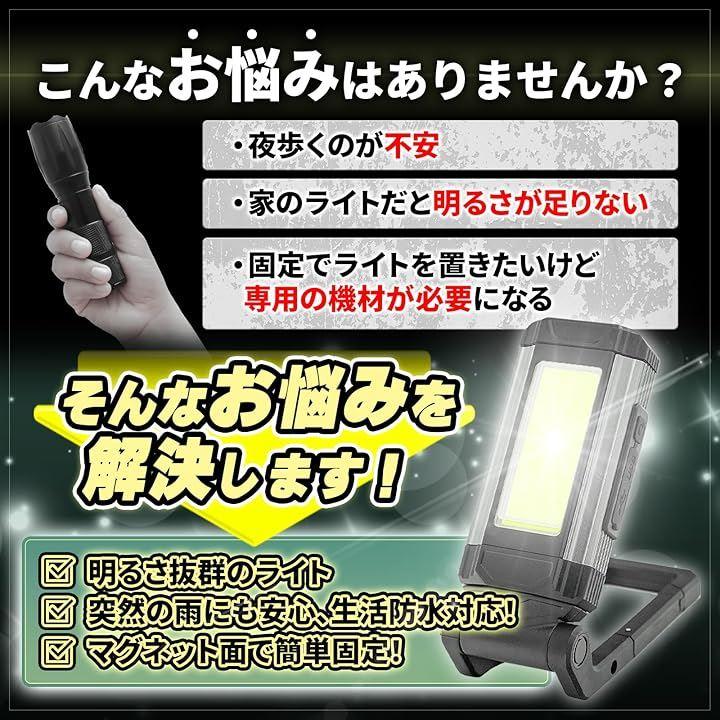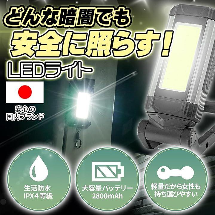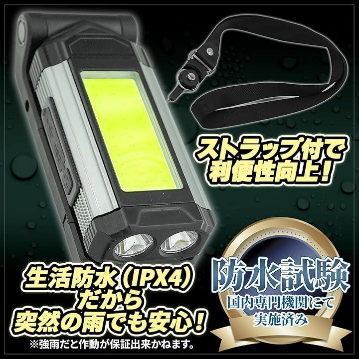 ・「LED・COB作業灯1台4役,ストラップ付」先端部のLEDで懐中電灯として、正面のCOBでワークライト、緊急時には赤色灯、さらには2800mAhのモバイルバッテリー(PSE認証済)としてもご利用できます。
