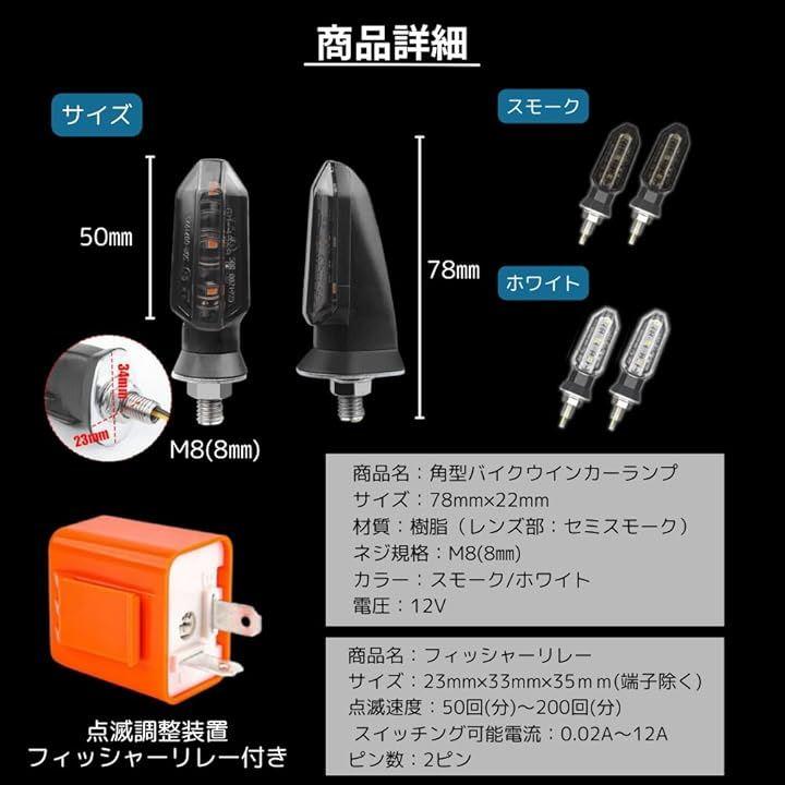 「本体の詳細」サイズ:7.8cmx2.2cm / 使用電圧:12V / 材質:樹脂(レンズ部はセミスモーク) / 発送色:アンバー(オレンジ) / 取付ボルトサイズ:M8 / 黄線>プラス、黒線>マイナス / 数量:2個セットor4個セット