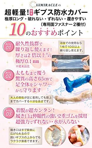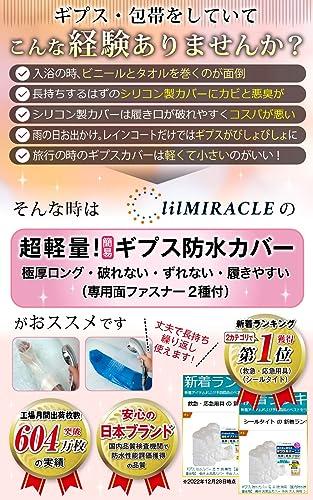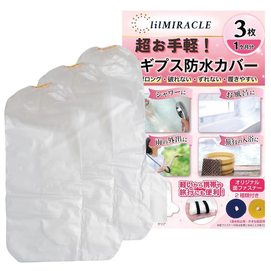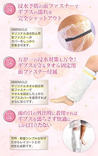 ?【内容物】ギプスカバー 防水 クリア 3枚(約1ヶ月分)・浸水防止専用面ファスナー1巻・タオル固定用面ファスナー1巻 ?【商品仕様】男女兼用 大人子供兼用(身長130cm以上) 対象部位:足(膝より下)・手腕も可 厚み:0.1㎜以上 底長:約38.5㎝ 高さ:約65㎝ 履き口:2重ゴム(最大口径約48㎝) 重量:カバー1枚約20g 色:クリア(透明)・面ファスナーの色は選べません。※サイズや重さ質感などは商品により若干の誤差があります。 ?【医療機関での取扱実績あり】日本国内の医療機関向けに販売実績があります。【国内検査機関で防水検査合格】日本の厳しい防水基準で連続5時間の防水性能試験を行い検査機関から正式に認められた日本品質のギプスカバーです。さらに履き口からの水の侵入をよりハードに防ぐため繰り返し使える浸水防止用面ファスナーとシールタイト使用時の大きな問題である発汗による蒸れ濡れを防ぐタオル固定用面ファスナーが付属されています。 ?【性能】使い捨てで衛生的な上、濡れ対策も万全!タオルを巻き付けるために必要な専用面ファスナーを付属。さらに履き口からの浸水を防ぐための面ファスナーも同梱。万が一の浸水対策もバッチリ!また従来品の2倍の極厚で破れにくく、浴室での利用なら繰り返し使うことが可能です。高さは膝上を余裕でカバーする超長65㎝でバスチェアに座ってシャワーを浴びる時にはお湯が入ることはまずありません。使い終わったらそのままゴミ箱へ。 ?【安心の120日間長期保証】lilMIRACLEでは独自の120日間保証がついています。万が一、当社のギプスカバーに不備や不良があればすぐに交換、返金にて対応させていただきます。スタッフは全て日本人で、お客様へご満足いただき問題を解決するよう常に最善を尽くしております。※本製品は完全に防水を保証する商品ではありません。水の染み込みが発生したことによるギプス・包帯・靴・衣類の濡れ・汚れ・損傷等の保証や本製品をご利用時のトラブルの保証は出来かねます。※この保証は1枚のカバーが連続して120日間使用できるということではなく、その期間は交換や返金ができるということです。