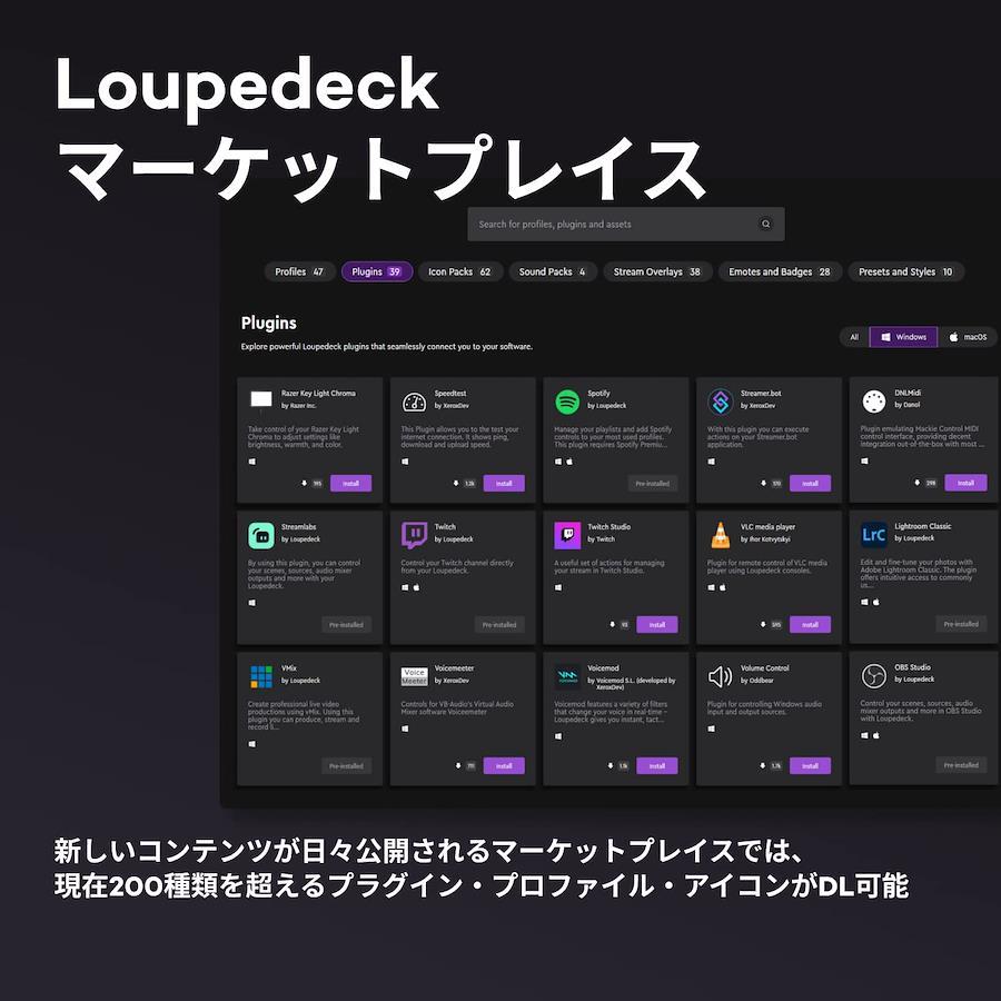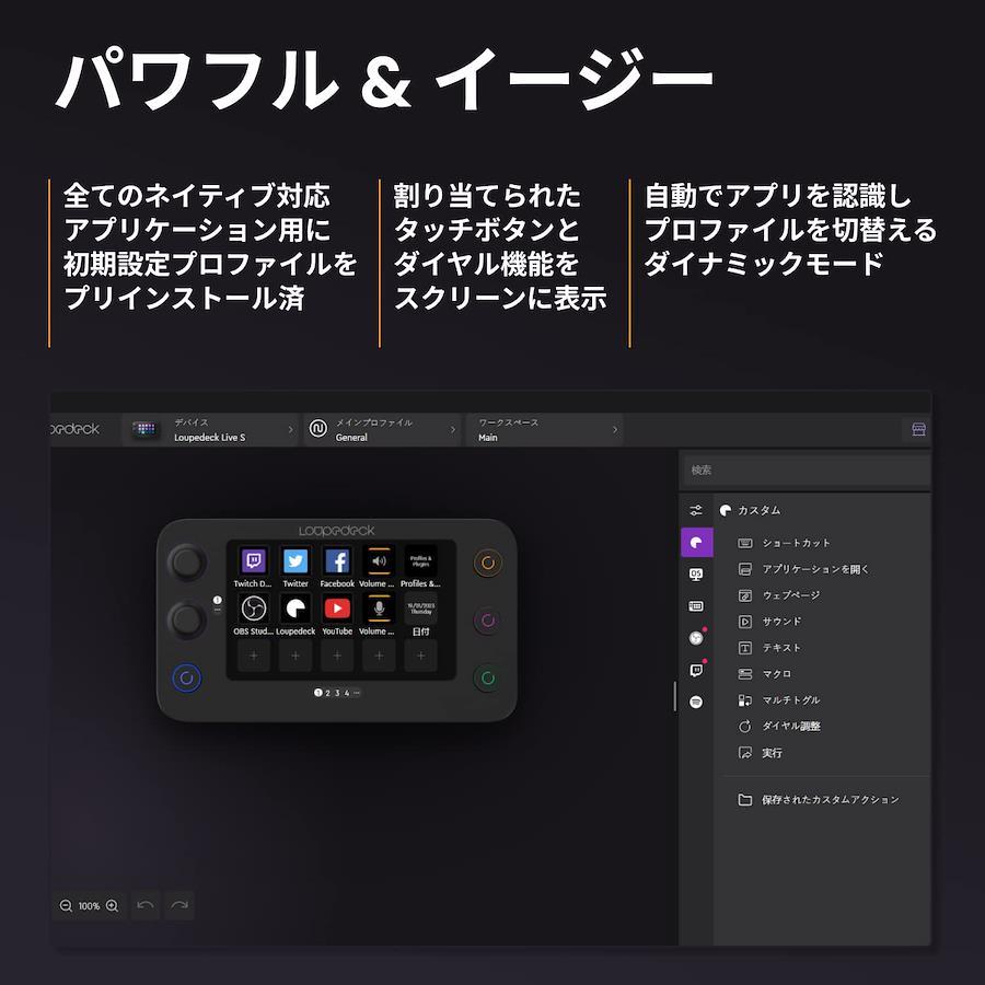 豊富なネイティブ対応プラグイン: OBS Studio, Streamlabs (Windows), Twitch, Ecamm, vMix, Spotify, Adobe Premiere Pro, Final Cut Pro, Photoshop 等、その他主要なストリーミング、編集用アプリケーションにAPIベースで対応し、複雑なアクションも簡単にコントロールします。各プロファイルも初期設定されており、すぐにご利用頂けます。配信作業のコントロールセンターに: 1. 配信、チャット、音声、マイク、ライティングを自在にコントロール 2. メディア、アプリケーション、WEBなど各ツールの起動 3. ダイヤル操作で編集やカラーグレーディングも瞬時に実行 4. アプリケーションやプロファイル間をストレスなく自動で切替。充実したマーケットプレイス: 200種類を超えるプロファイルやプラグイン、アイコンやサウンドパックをダウンロードできます。Microsoft Flight Simulator, Twitch Studio, Philips Hue, Nanoleaf, Razer, Elgato, Voicemod, GoXLR, Voicemeeter, Davinci Resolve Color Panel, Notionなどの人気ツールが公開されており、日々新しいコンテンツが追加されています。強力なカスタマイズ性: 最大14ページに及ぶタッチボタン及びダイヤルの設定が可能で、スワイプでページ間を簡単に移動。複雑なマクロコマンド(複数のアクションを一度に実行)やマルチトグル(同一ボタンで実行する毎に機能を変更)、ダイヤル調整アクションなど、数多くのアクションを作成して割り当てることができます。直感的な操作が可能に: フィードバック機能付きLEDタッチボタン、押し込み機能付きアナログダイヤル、カスタム可能なRGB物理ボタンを搭載し、直感的なコントロールを実現しました。