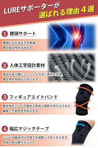 ?【膝の専門家監修のもとサポーターを作製】膝の専門家だからこそわかる膝のポイントを抑えたサポーターです。 ?【膝の不快感を楽に・膝のケガ対策に】LURE(ラーレ)の膝用サポーターは、「膝の不快感を楽に」「膝の不安定性やグラつき対策に」「膝のケガ対策に」の3つの強みがあります。がっちりと安定した膝サポーターです。 ?【膝を守る4つの機能】膝用サポーターの特徴として、「厚みのある素材」「膝にフィットする形」「がっちり膝を抑えるフィギュアエイトバンド」「圧力調整をしやすい幅広マジックテープ」の4つの機能があります。膝に掛かる圧力を調整して膝の動きを快適にします。 ?【あらゆる場面で活躍できる膝サポーター】医療分野やスポーツ選手、高齢者など幅広い人に適用され、また、バレーボール・ウォーキング・ランニング・野球・サッカー・バスケットボール・自転車・バイク・エアロビなど様々なスポーツの分野で活躍できる膝用サポーターです ?【洗濯可能で清潔感〇】LUREの膝用サポーターは洗濯が可能です。※ネット洗い推奨。常に清潔感を保てます。洗い替え用に複数購入される方も多くいらっしゃいます。