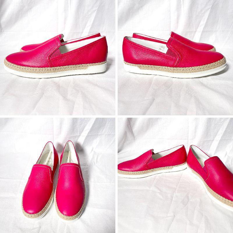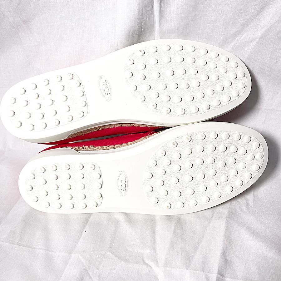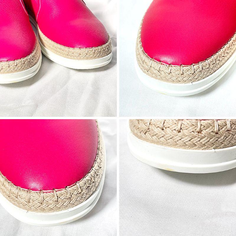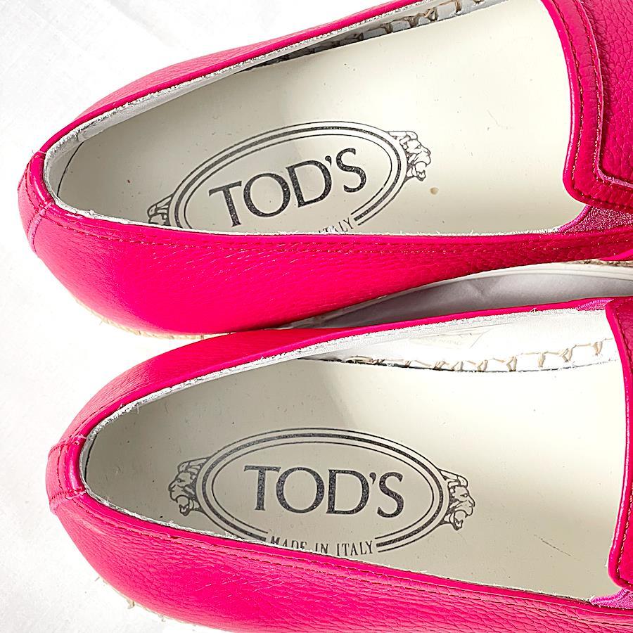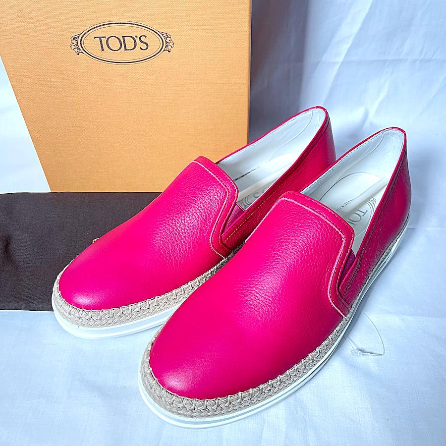 【ブランド】TOD’S【品名】エスパドリーユ スリッポン【対象】レディース【サイズ】38 1/2【実寸(cm)】アウトソール全長約27.5cm、同横幅(最長部)約9.8cm*多少の誤差はご容赦ください【素材】レザーほか【原産国】イタリア【カラー】ピンク系【商品状態】使用感がほとんど感じられないお品です。試着程度ではないかと思われます。ごく軽微な汚れあり。画像もよくご覧ください。二次流通品ですので、軽微な傷や汚れなどはご容赦くださいませ。