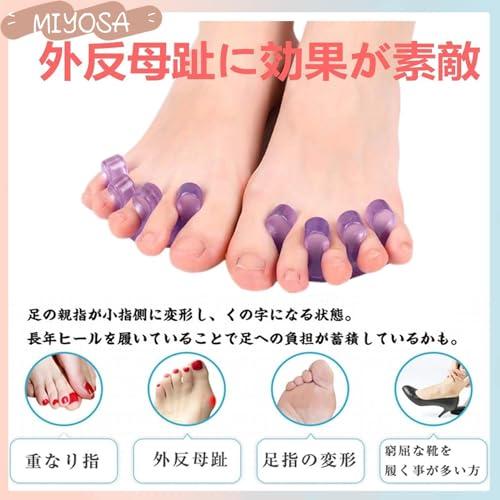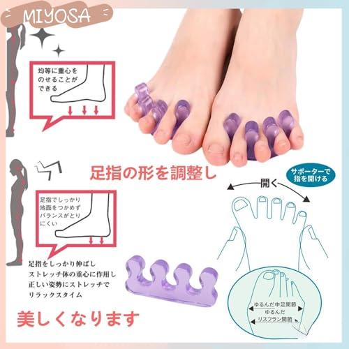【外反母趾・内反小趾改善】足指を分離させて、外反母趾・内反小趾を有効的に予防します。弧状を採用して、装着便利で、安定性が良い、親指応力を改善し、外反母趾と内反小趾の回復を促進をサポートすることができます。お家用の足指サポーターは五本の足指形に合わせた曲線設計で足指の関節をリラックスさせ、外反母趾、内反小趾、浮指、寝指、親指ハンマー指、足指の曲がり(屈曲)などの足指トラブルを解決します。 【高品質シリコン材質・アーチ型デザイン】足の構造を研究して足指の圧力を均一に分散させるアーチ型デザイン。クッション性、伸縮性、耐久性に優れたシリコンを採用し、長時間の使用でも形状を保つことができます。 外反母趾矯正グッズ / 内反小趾矯正グッズ として大活躍です。 【取り付け簡単】足指にはめるだけの簡単装着で、 ジェルクッション のプニプニした感触が気持ち良く、違和感なく着用できます。通勤時はもちろん、就寝時や運動時(ランニング、ヨガ、スポーツ)にもお使いいただけます。お風呂でも装着可能で フットネイル の際にも便利です。 【痛み緩和・歩行補助】足指矯正バッドは、靴を履いた後のつま先の痛み、内反母趾や外反母趾の痛み、足指の重なりや付け根の痛みお困りの方に快適に必要なサポートを提供します。足指をやさしく保護することで、痛みを軽減して、気軽に歩きます。 【水洗より繰り返す利用】足指サポーターはシリコン素材で、水洗い出来るから、毎日のお手入れも簡単で清潔に使用できます。また、洗った後は直射日光を避けて乾燥させて下さい。足指サポーター保護するために、商品の表面はタルカムパウダーをつけています。ご遠慮なく利用してください。