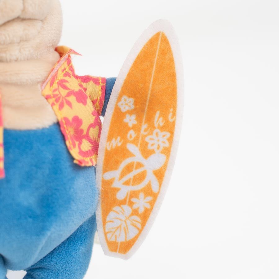 Details・Size: Mini・Color: Blue・Accessories: Flower shirt, hibiscus flower, flip-flops, surfboard, ball chain for hanging・Tanned plush fabric with a summer glow・ZenPlus exclusive・Mochi Fabric