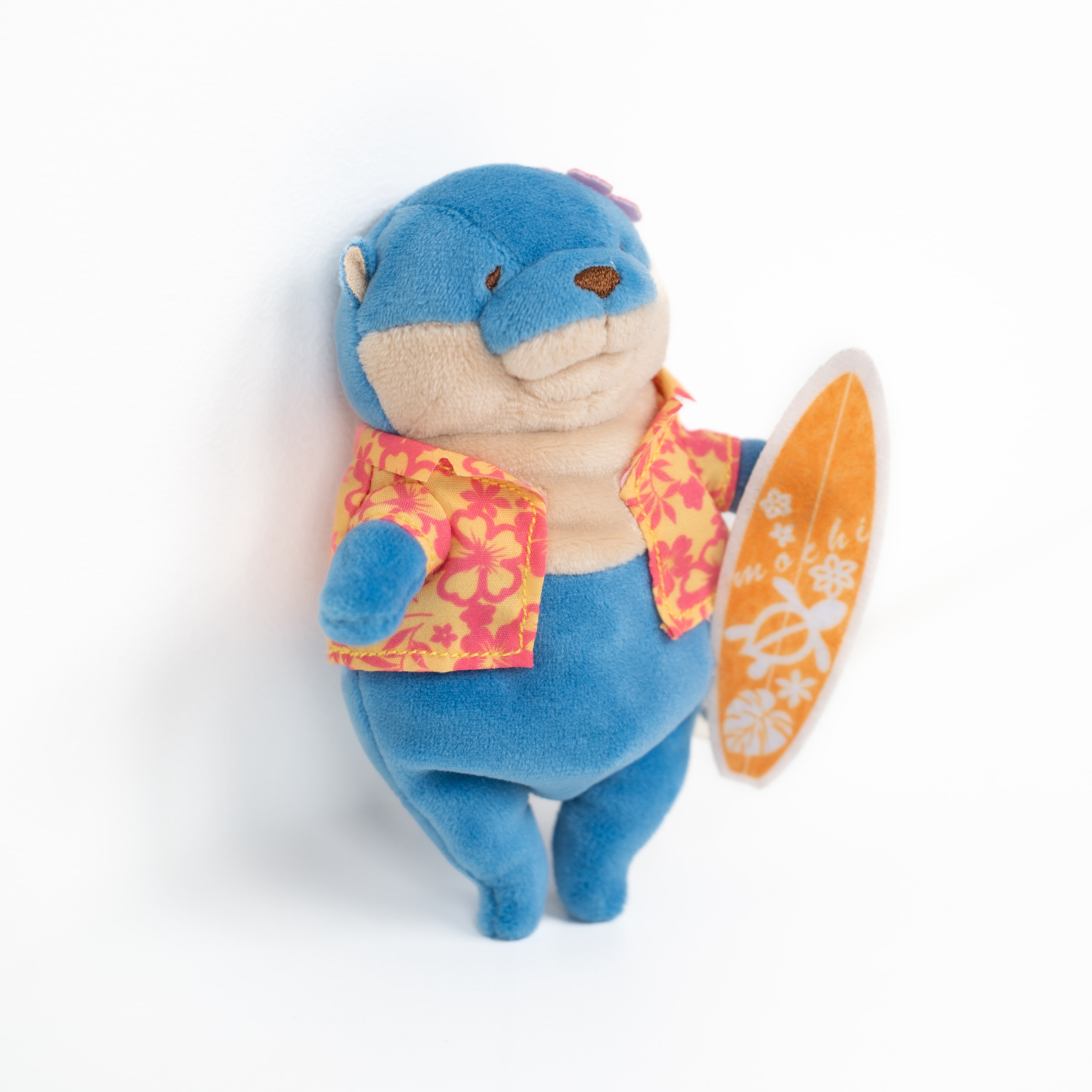This mini Blue Surfer Otter is ready to ride with you wherever you go. With a sun-kissed tan, breezy flower shirt 🌺, tiny flip-flops 🩴, and a hibiscus flower next to the left ear 🌸, he brings all the tropical charm in a palm-sized plush.