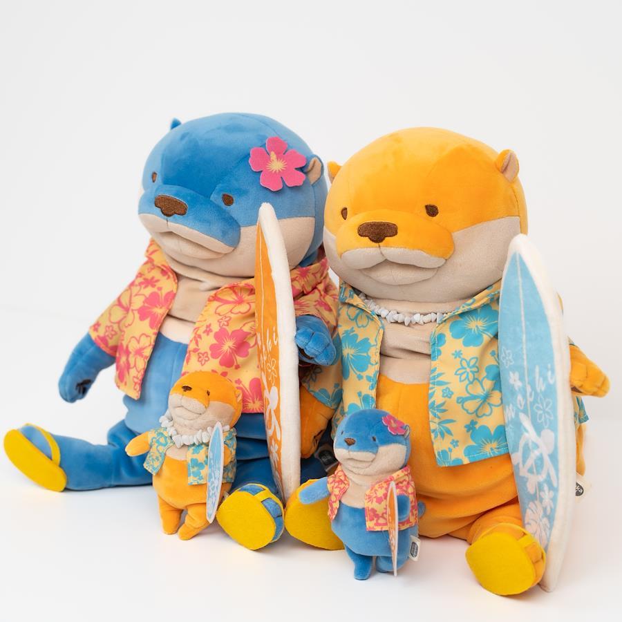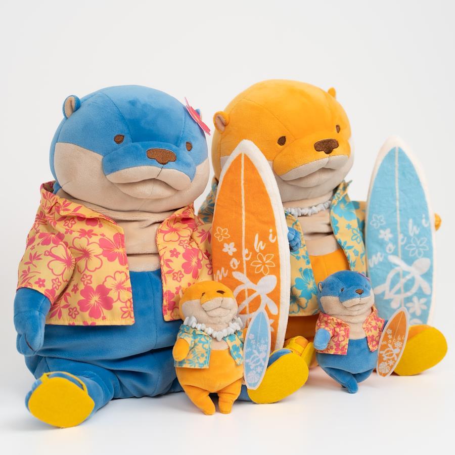 📿The Orange Surfer Otters wear a flower shirt, flip-flops, and a beaded necklace.🌺The Blue Surfer Otters wear a flower shirt, flip-flops, and a hibiscus flower by the ear.Mini sizes include a ball chain for hanging.🏄 All come with their own surfboard.