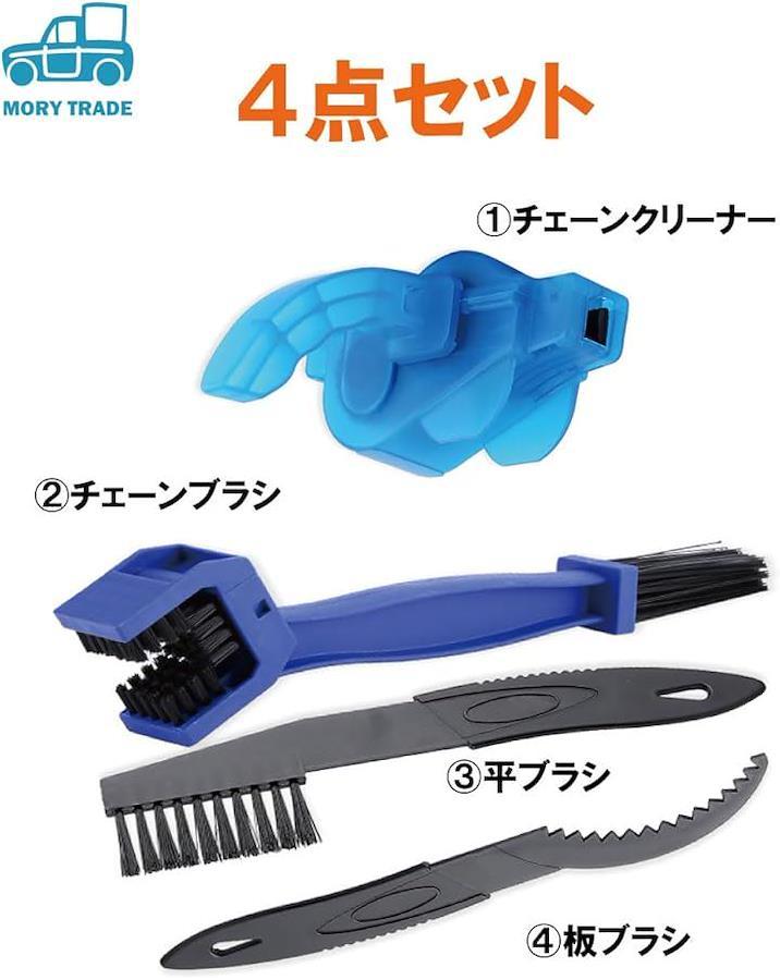キット内容 1)チェーンクリーナー 2)毛なしブラシ 3)毛ありブラシ 4)チェーンブラシ