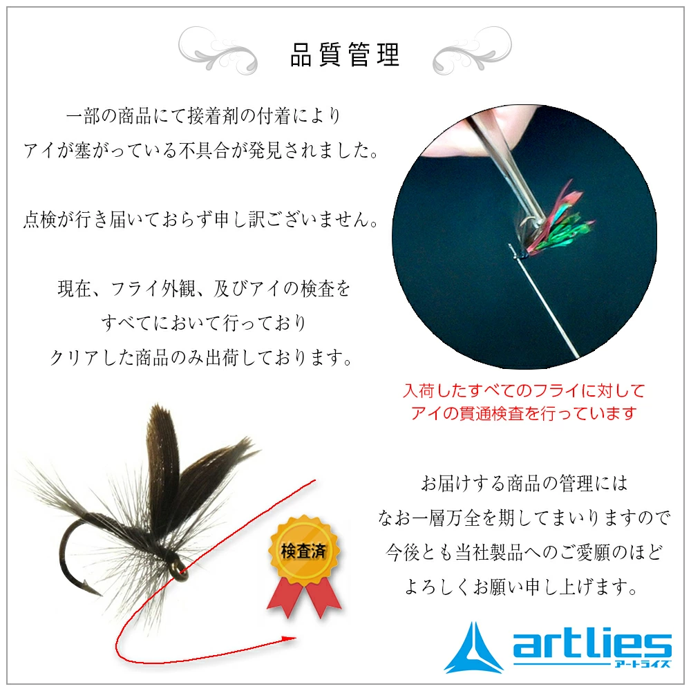 【重要・確認】フライは天然マテリアルを使用している為、画像とカラーが一致しない事があります。フックはフライパターンによって同一サイズでも大きさが違います。(テレストリアルやバス系はフックが特殊で大きいです)ご了承の上、ご購入ください。