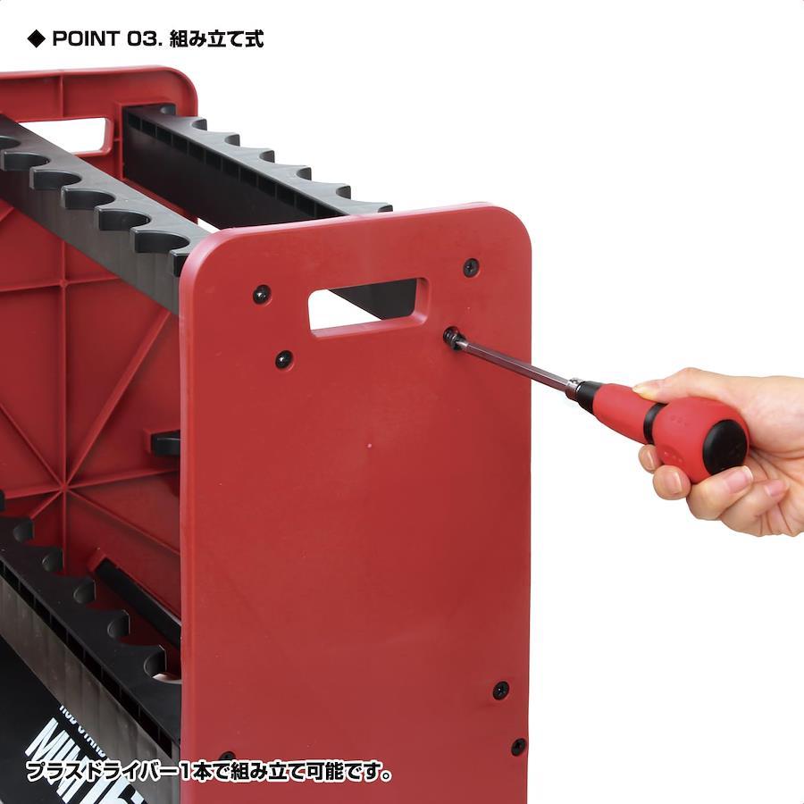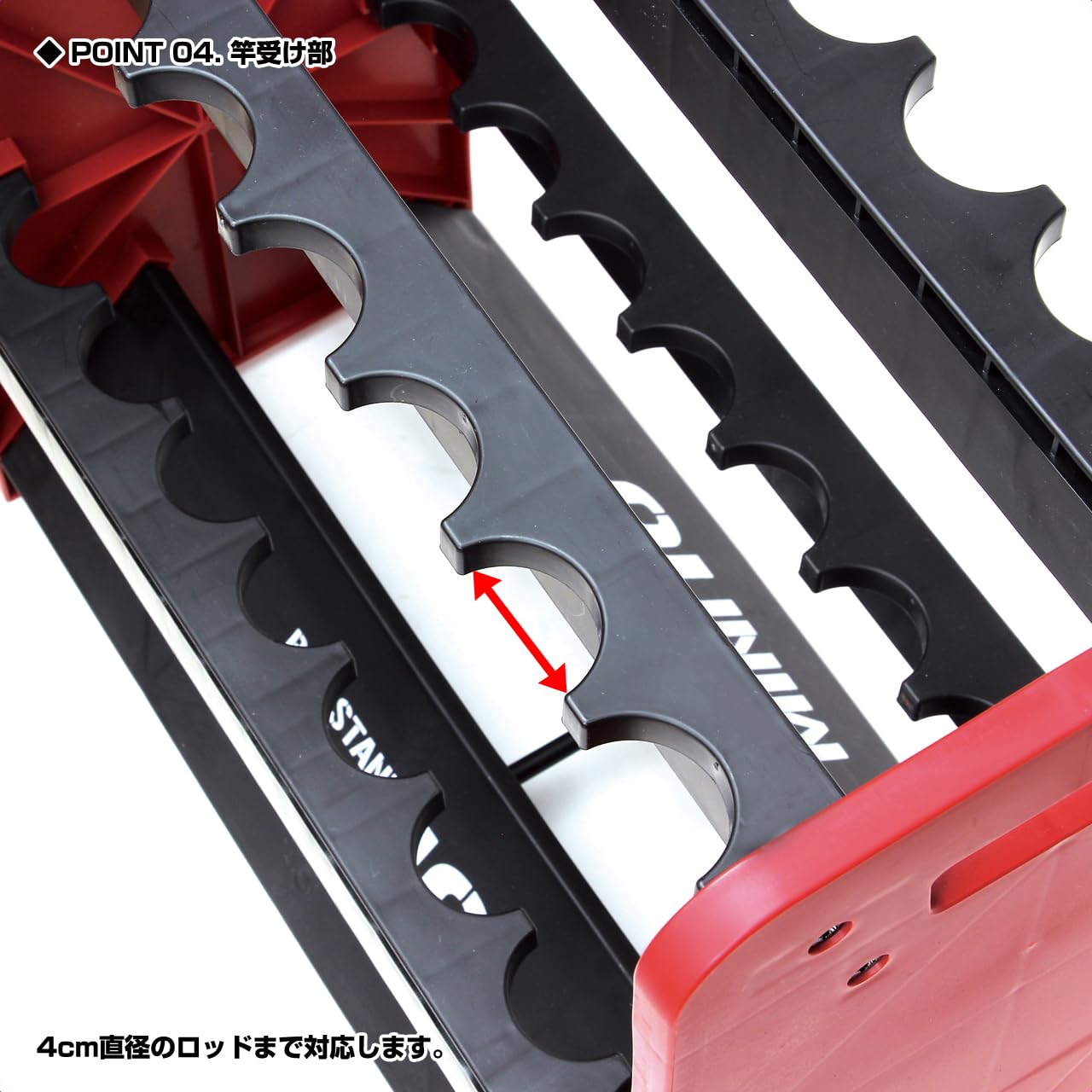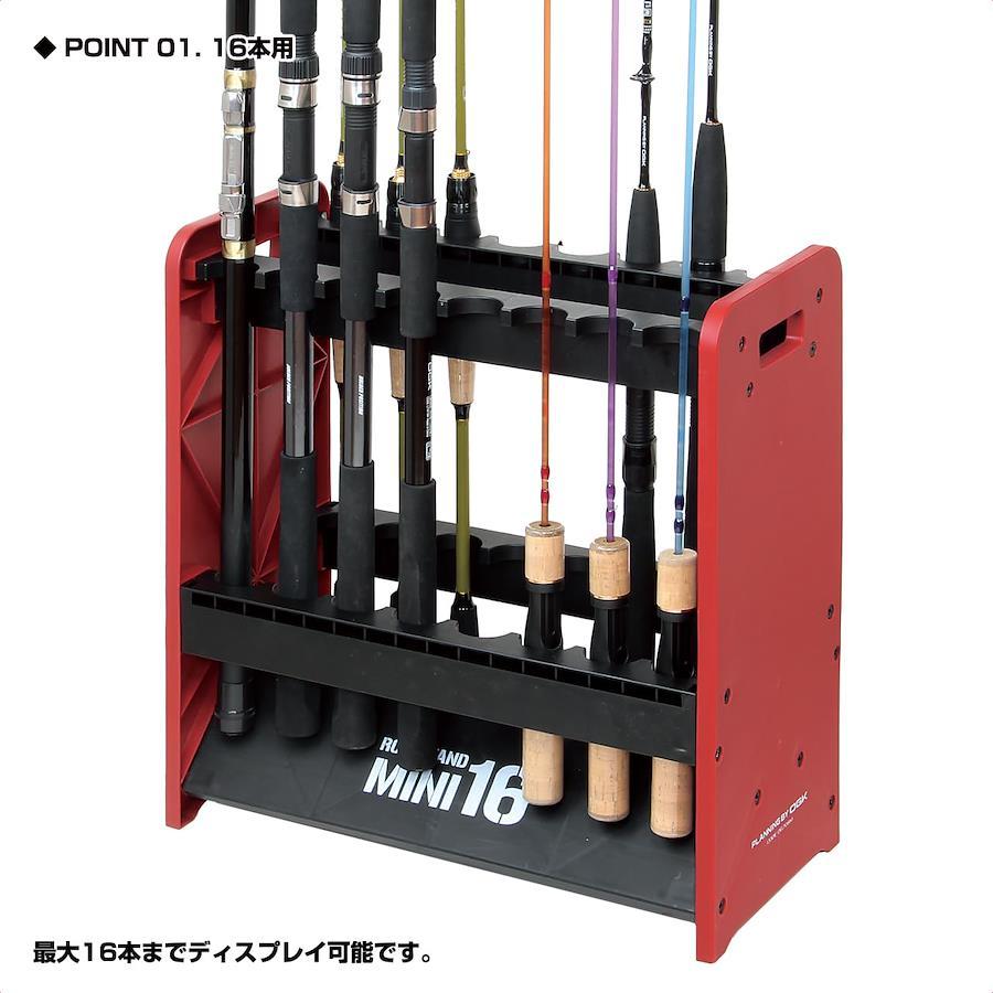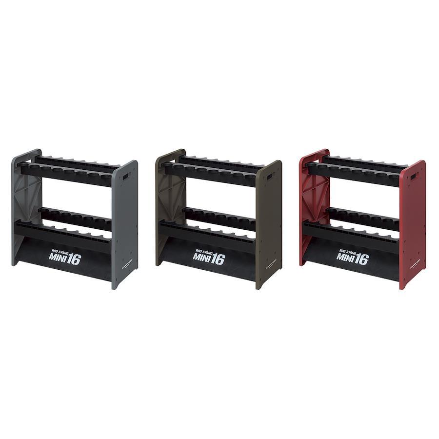16本収納可能な組み立て式ロッドスタンドのミニモデル。ドライバー1本で組み立て可能。完成サイズがW44.5×D21×H46.5cmとローモデル。表と裏にそれぞれ8本ずつ、合計16本のロッドや玉ノ柄の収納が可能。軽量な樹脂素材を採用。全色あつめてディスプレイしたくなる3カラーのロッドスタンド。