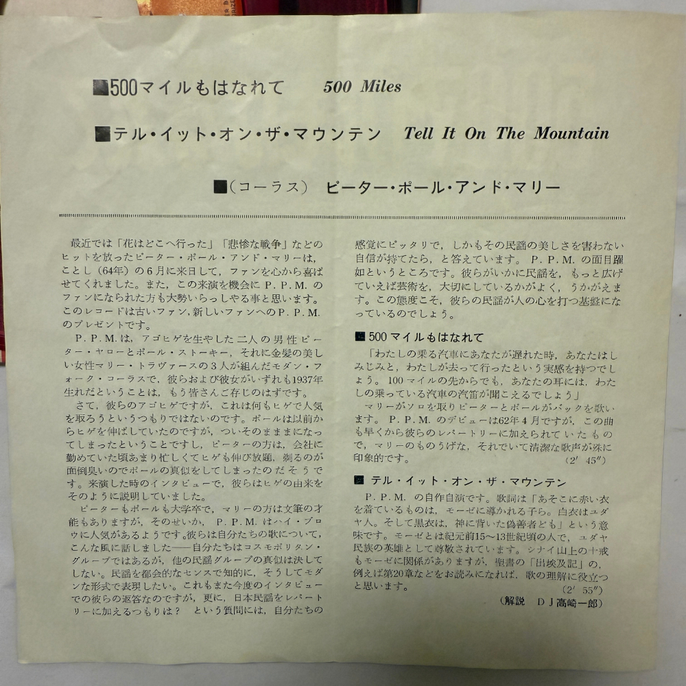 Peter, Paul and Mary Showa Era Vintage EP Record 500 Miles Away Tell It on the Mountain 7-inch Extended P