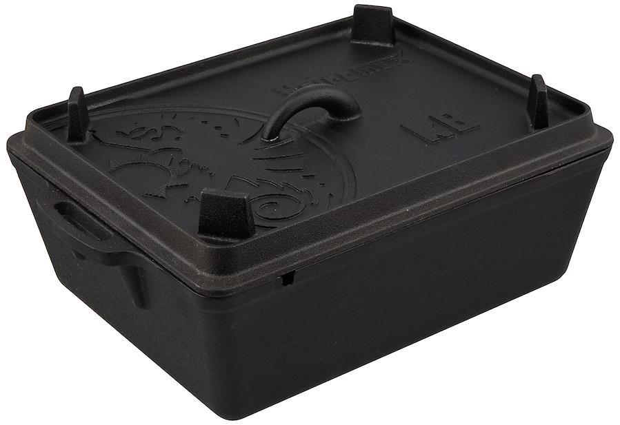 パンやケーキを作るのにも最適な箱型スキレット。高品質のキャストアイアン(鋳鉄)は熱をゆっくりじっくり伝えるので食材の本来の旨みを最大限引き出してくれます。フタには4本の脚が付き、裏面は波上の加工になっているので、食材をこんがり焼きながらも余分な油を落とすことができます。
