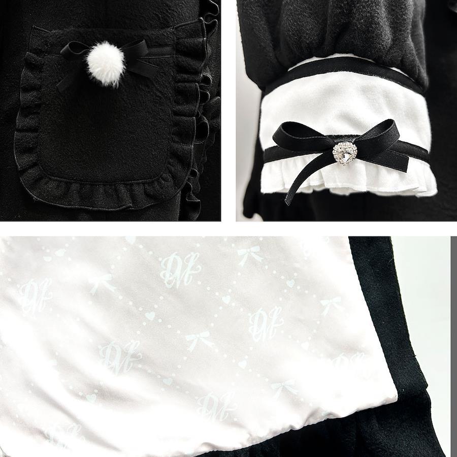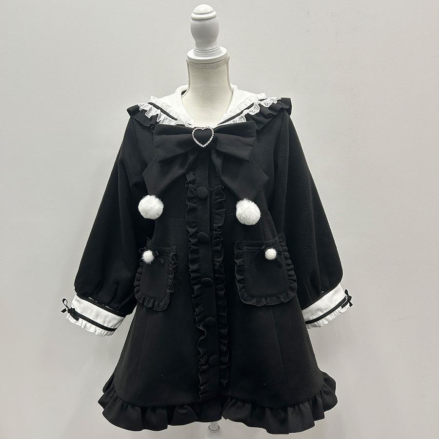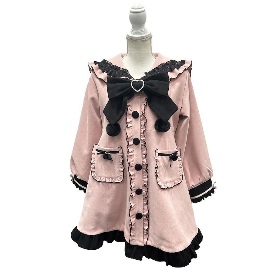 かわいすぎるセーラーフリルコートが新しくなって登場♪【デザイン】人気のセーラー襟デザインのかわいいAラインコートが新しくなって登場♪ポンポンリボンがかわいく、冬にぴったりのデザインになっています。フリルたっぷりで、襟にはレースがあしらわれていてどこを見てもかわいいデザイン。後ろには大きめリボンがついています。袖口、ポケットリボンは安全ピンで取り外し可能です。前立てのスナップボタンで着用が可能です。襟リボンは安全ピンで取り外し可能です。【素材】重みのある、ウールタッチの素材を使用しています。中綿などは入っていないので、着ぶくれしにくい素材感です。《透け感》なし 《生地の厚さ》普通 《裏地》あり 《伸縮性》なし《生産国》中国