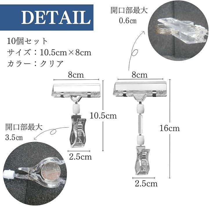 「セット内容」クリア10個 「サイズ」上クリップ幅:8cm 開口部最大:0.6cm / 下クリップ幅2.5cm 開口部最大:3.5cm / 全長:10.5cm