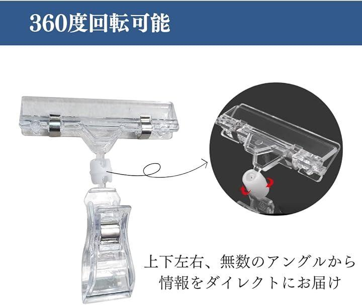 「どんな角度でもアピール」360度回転可能なポップクリップが、商品の魅力を最前線でアピール。上下左右、無数のアングルから情報をダイレクトにお届けし、お客様の目をキャッチします。