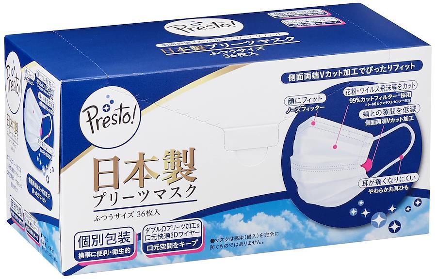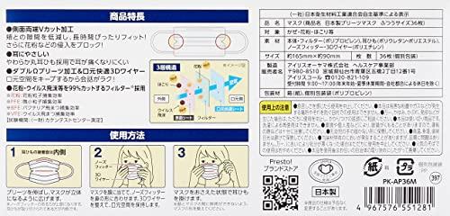 ●花粉やウィルス飛沫等99%カットフィルター採用 ※(一財)カケンテストセンター測定●側面両端Vカット加工で、頬との隙間を低減し、長時間ぴったりフィット●耳にやさしいやわらか耳ひも採用で長時間つけていても、耳が痛くなりにくい●3Dワイヤーで口元空間キープ、息がしやすい●一枚ずつしっかり包装されているからバッグの中で汚れる心配無し、持ち運びに最適 内容量/36枚入(個包装) 商品サイズ(cm)/ふつう:幅約16.5×高さ約9 素材:本体・フィルター(ポリプロピレン)、耳ひも(ポリウレタン・ポリエステル)、ノーズフィッター・3Dワイヤー(ポリエチレン) 対象:風邪、花粉、ほこりなど ブラント名:Presto! (プレスト) (#lf)(#lf)(#lf)商品購入前に、ストア紹介ページをご確認ください。