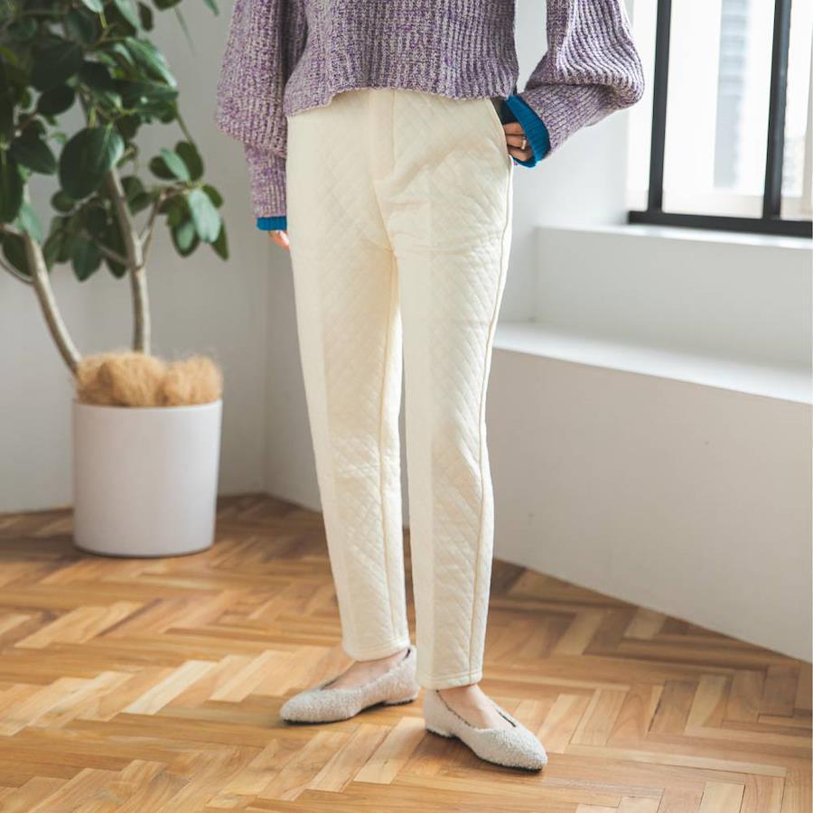 裾に向かって細くなるテーパードシルエットは、着ぶくれせずすっきりと着こなしていただけます。キルティングで暖かさを。テーパードシルエットで美脚効果を叶えた最強パンツ。