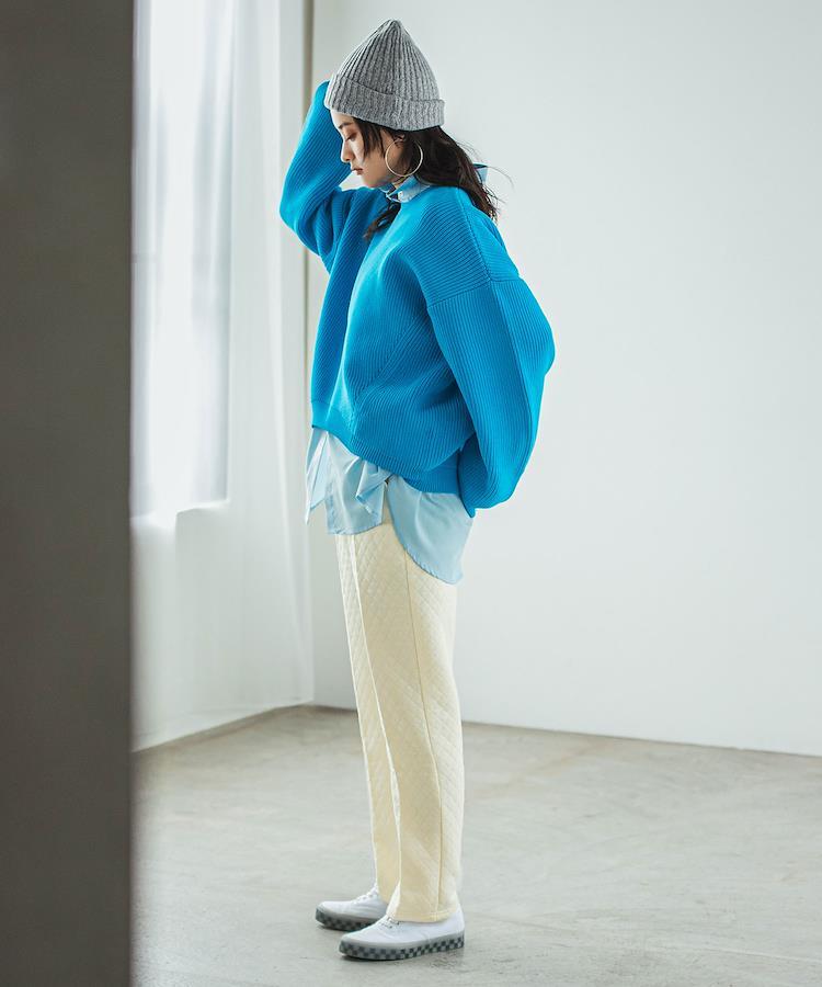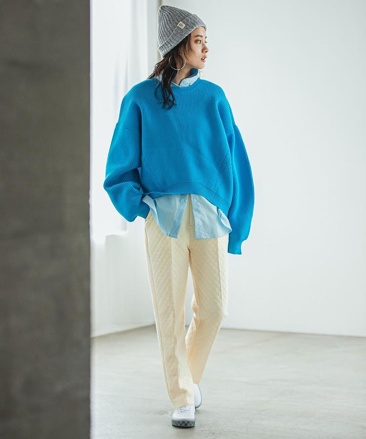カジュアルに合わせるならスウェット。キレイめに合わせるならハイゲージのニットですっきりと。