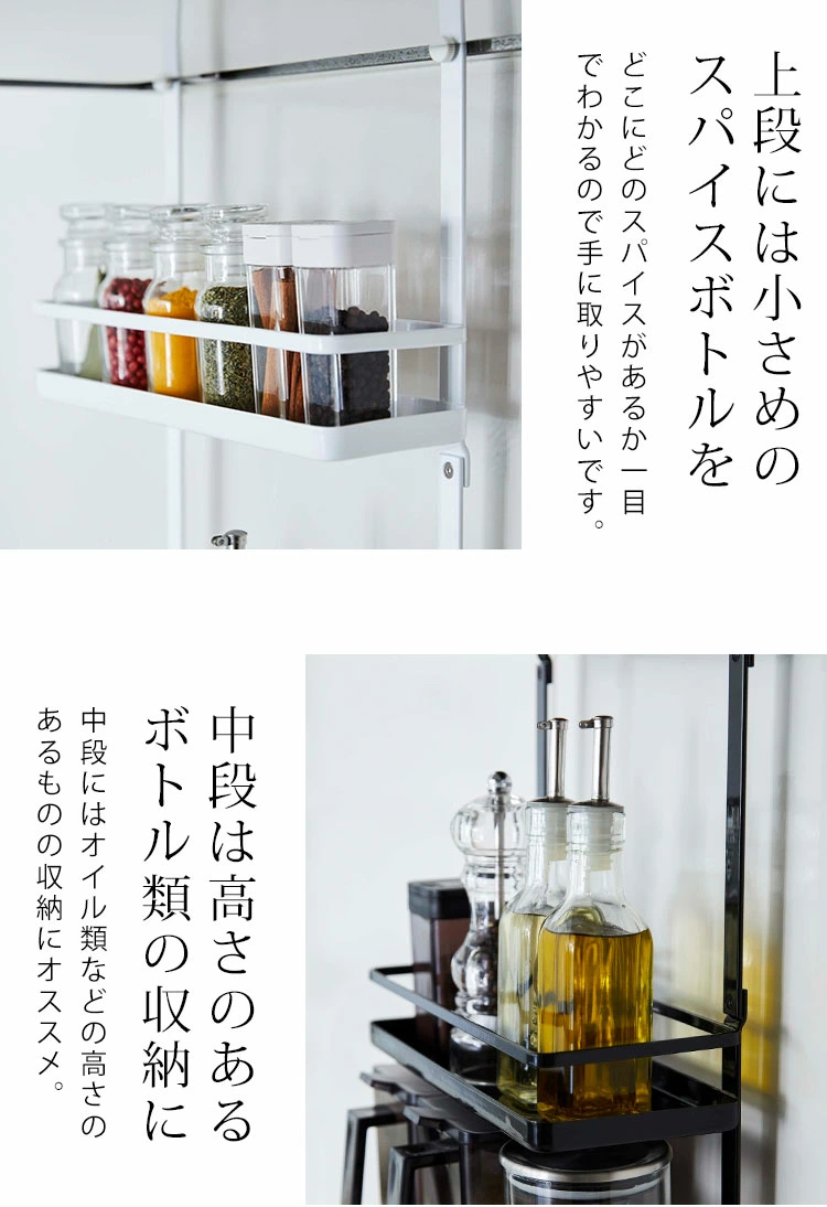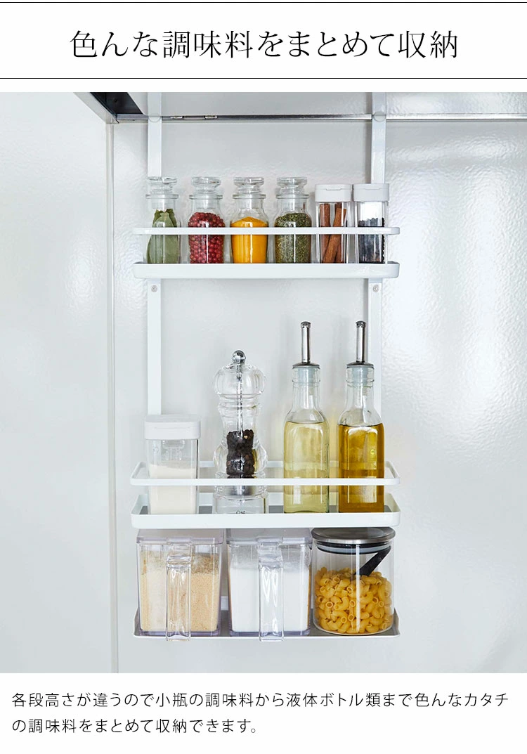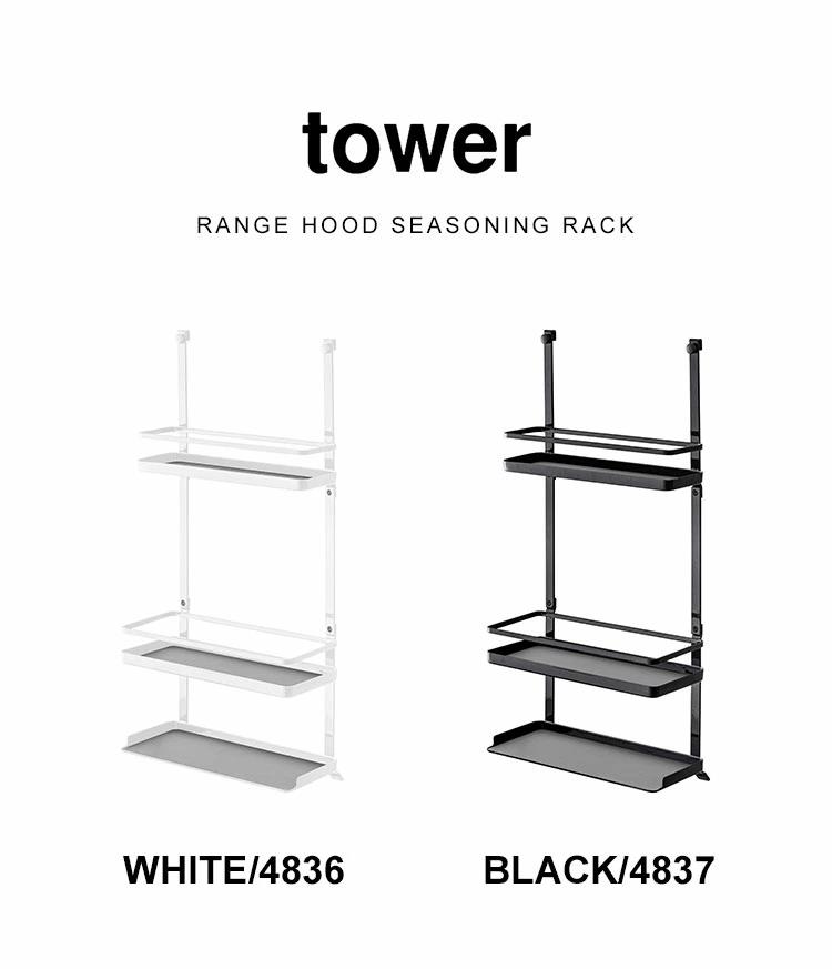 【レンジフード調味料ラック 3段】どんどん増えて置き場に困る調味料類をまとめて収納できる、towerのレンジフード調味料ラック。デッドスペースになりがちなレンジフードに引っ掛けるだけで簡単に設置が可能◎収納した物が滑らないよう各段の底にシリコーンマットが付いていて安定感もあります。