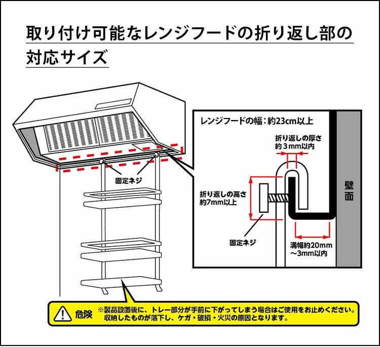 ■仕様レンジフード対応サイズレンジフードの幅:約25.5cm以上折り返しの厚さ:約3mm以内折り返しの高さ:約7mm以上溝幅:約2~3mm以上