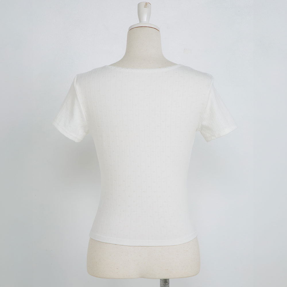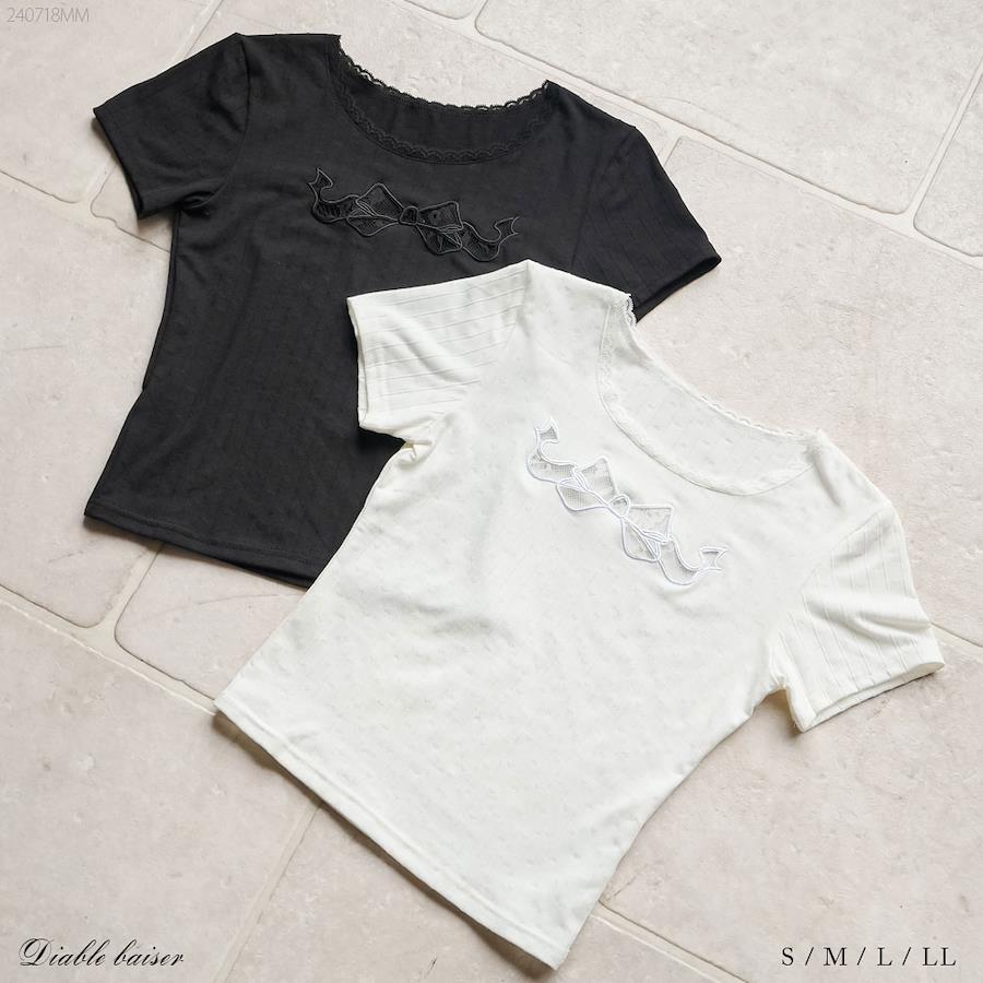 ◆Designリボンのディテールが加わることで、さらにキュートでロマンティックな印象を与えます。素材にまでさりげないハート柄でリブカットソーになっています。
