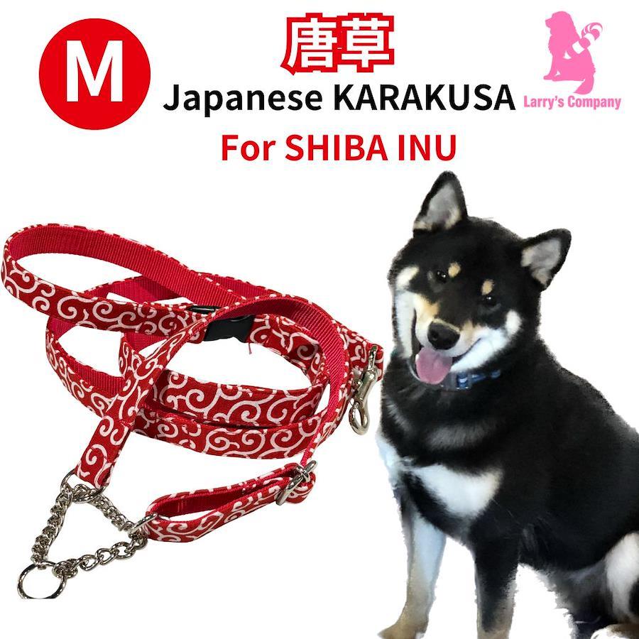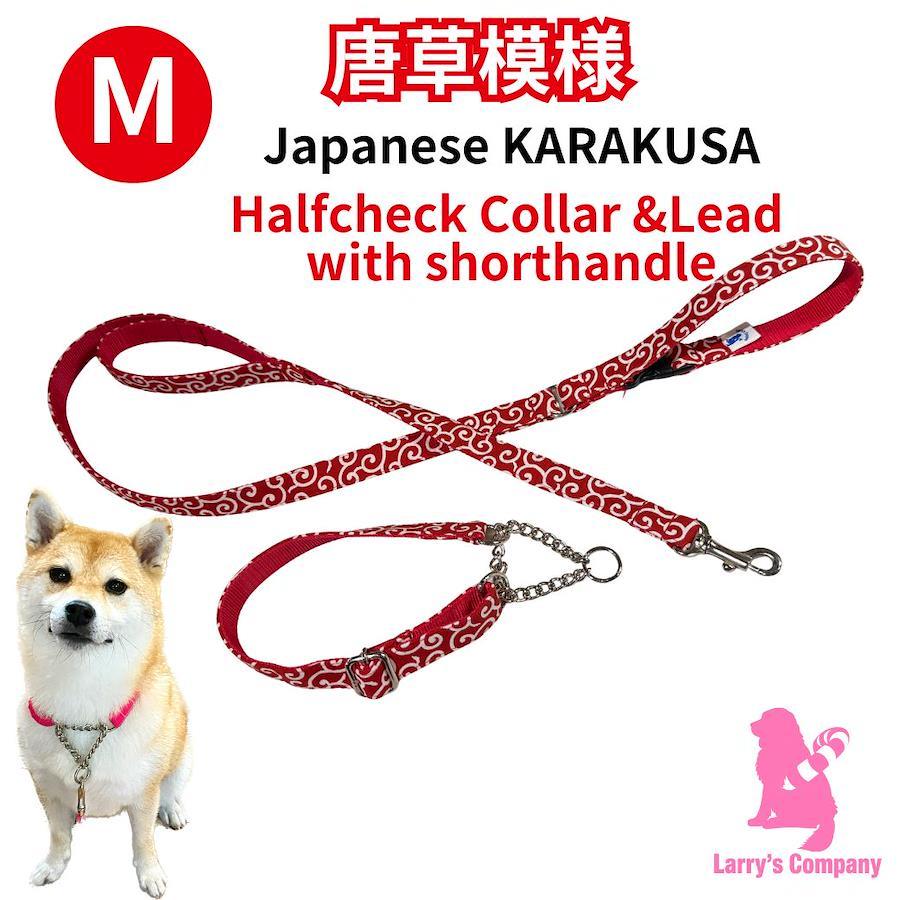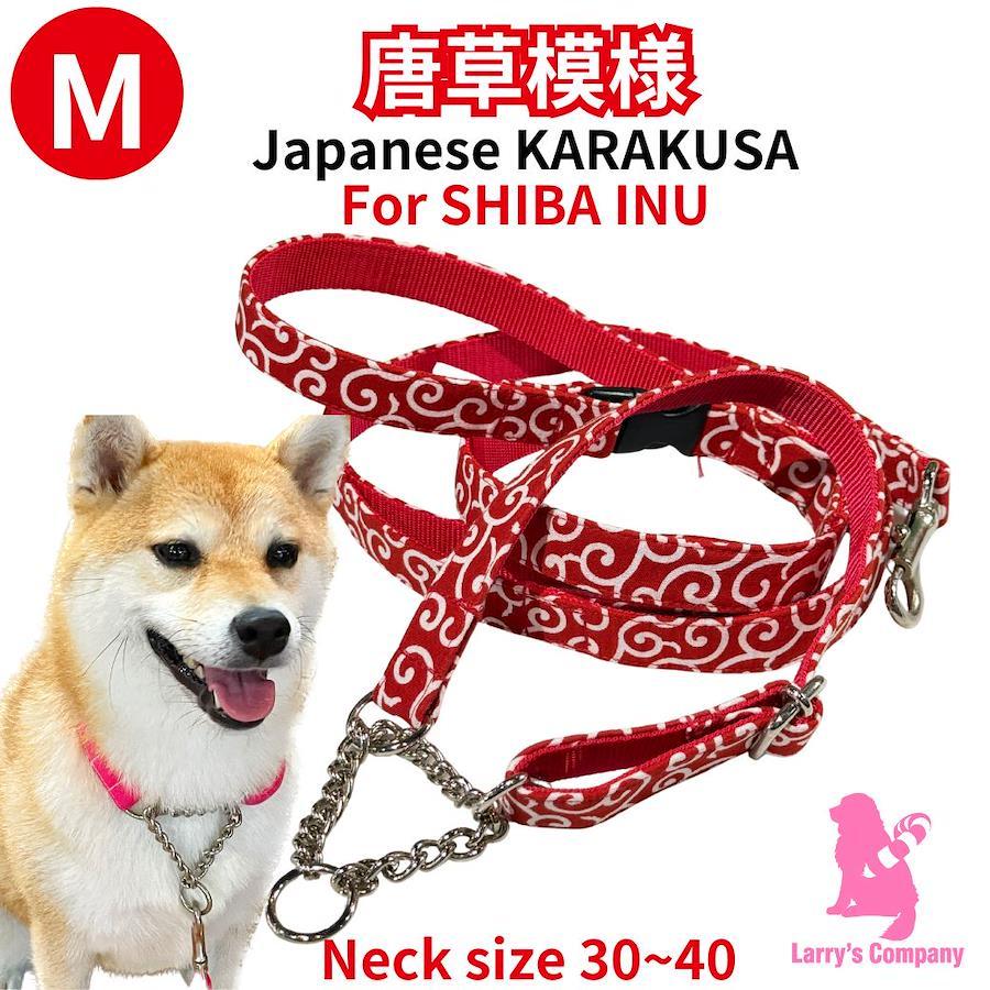 柴犬のお散歩にピッタリ、赤と白の唐草がらの布で作りました。中型犬用、ハーフチョークカラーとリードのセット。