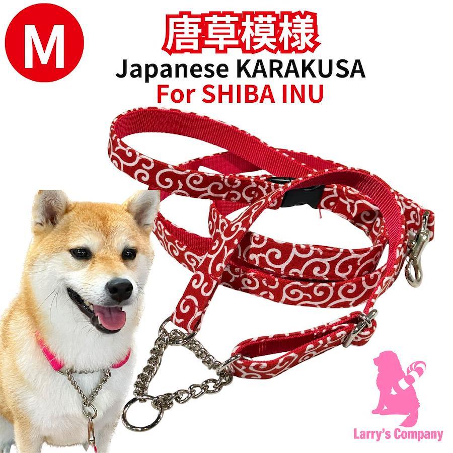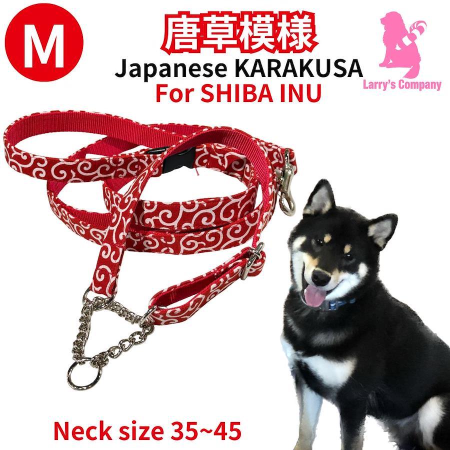 柴犬のお散歩にピッタリ、赤と白の唐草がらの布で作りました。中型犬用、ハーフチョークカラーとリードのセット。
