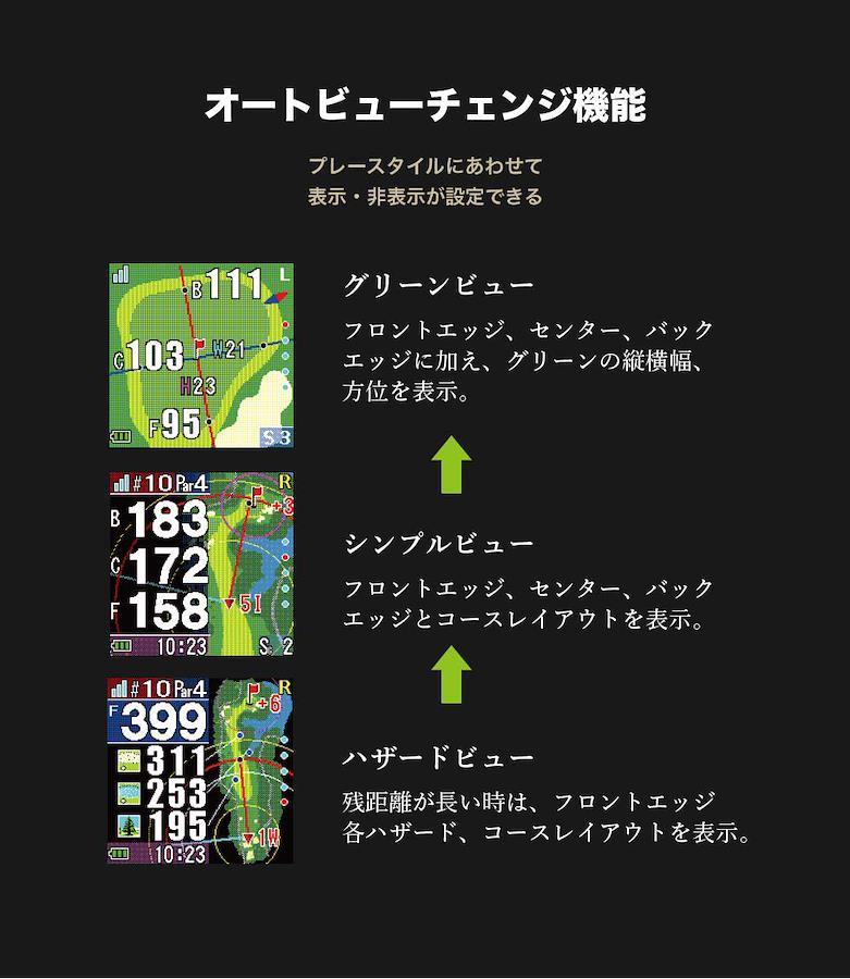 :屋外で見やすい反射型カラー液晶を採用。フルレイアウト表示腕時計型GPSゴルフナビ。超高精度「みちびきL1S」対応!高低差・目安距離・推奨番手案内機能付き!信頼と安心の「日本製」(Made in Japan)