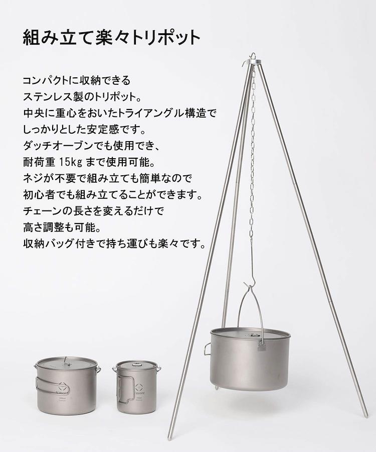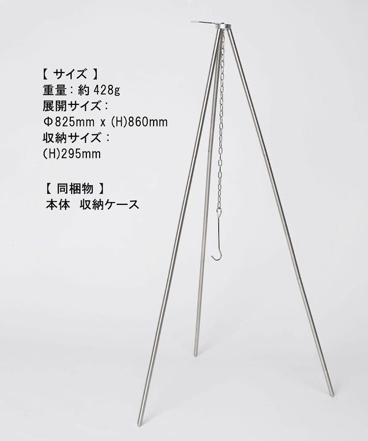 【サイズ】重量: (約)428g、展開サイズ: 径825mm x (H)860mm、収納サイズ : 295mm、中央に重心をおいたトライアングル構造で安定感は抜群です。コンパクトになる重量鍋用トライポッド、管壁の厚みを増やしたことで、耐荷重15kgまで実現した商品です。 ダッチオーブンでの使用も可能です9本のステンレス製の棒を、ネジ不要、組立も超簡単!女性でも簡単に操作できます。。焚き火三脚の脚を広げるだけで簡単に組立できます。強い耐荷重に40cmとコンパクトな収納となっていますので、持ち運びに便利です。キャンプで焚き火をする時には必須と言えばいいクッキングトライポッドです。チェーンの長さを変えるだけで火と鍋の距離を変えることができます。ミニ型スタンドなので、収納バックも付いてあり、軽くて持運びやすくて携帯に超便利です。部門名: ユニセックス大人