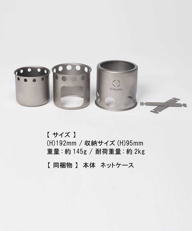 使用サイズ:(H)192mm/収納サイズ:(H)95mm重量:約145g、耐荷重2kg。【超軽量で丈夫】アルミニウムのように軽く、ステンレスのように頑丈、チタンは金属の中でも最も強度が高い、軽量で機能的、その上、この多機能のオリジナリティ溢れるデザインはキャンパー心をくすぐります。薄く作られるなので驚きの軽さ!日常用にもアウトドア用にも適用する仕様です。【チタン製品】本製品にはチタニウムを採用となり、軽量かつ丈夫で、サビや熱に強い素材です。高硬度、絶対に錆びない、耐食性/耐熱性にも優れ、金属臭いも無く魅力あふれる安全な金属です。【厳しい環境にも安定性】チタンの融点が高いので、高温明火炊事後も変形しにくい。チタンの強度は温度の低下に伴って向上し、低温環境下では冷えを感じず、通常の金属の冷たさに抵抗するため、冬のキャンプが好きな人に向いています。【どこでも使いやすい】収納袋の背面はメッシュ通気加工で、カトラリーを洗った後収納袋の中に放置して、自然乾燥しやすくて便利です。コンパクトの収納サイズで、ソロキャンプやツーリングキャンプ、テント泊の登山など、ピクニックやお弁当にも携帯性が高い道具セットです。便利な木材追加用の開口付き、ボトムにいくつかの小さな穴は、燃料が完全に燃焼するのを促進します。.環境にやさしく(Eco Friendly)、乾いた草と小さな枝が化学燃料に取って代わります。 ガソリンだけでなく燃料缶もバイバイ。ソロキャンプに適したミニサイズ。 純チタンで作られており、軽量でありながら頑丈で、また、収納サイズはコンパクトで、登山、キャンプ、BBQ、サイクリングツーリングなどアウトドア活動に最適です。燃焼後の美しいチタン焼き色も特徴です。