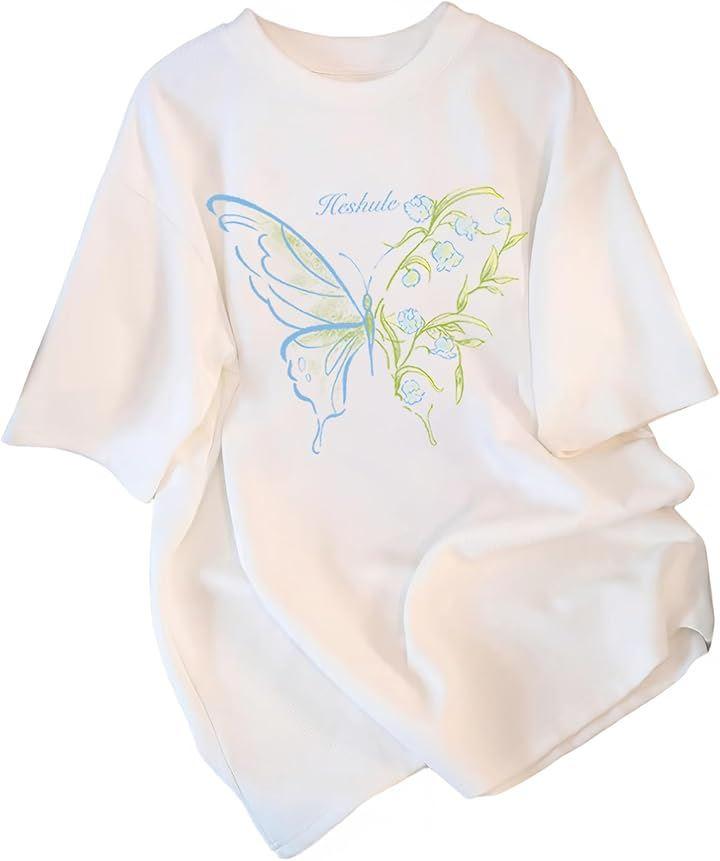 Tシャツ ゆったり 大きめ フロント バタフライ フラワー プリント カジュアル 背面 無地 レディース 女性 用 春 夏 秋 冬 服 半袖 トップス 体型カバー オーバー サイズ ビッグ シルエット