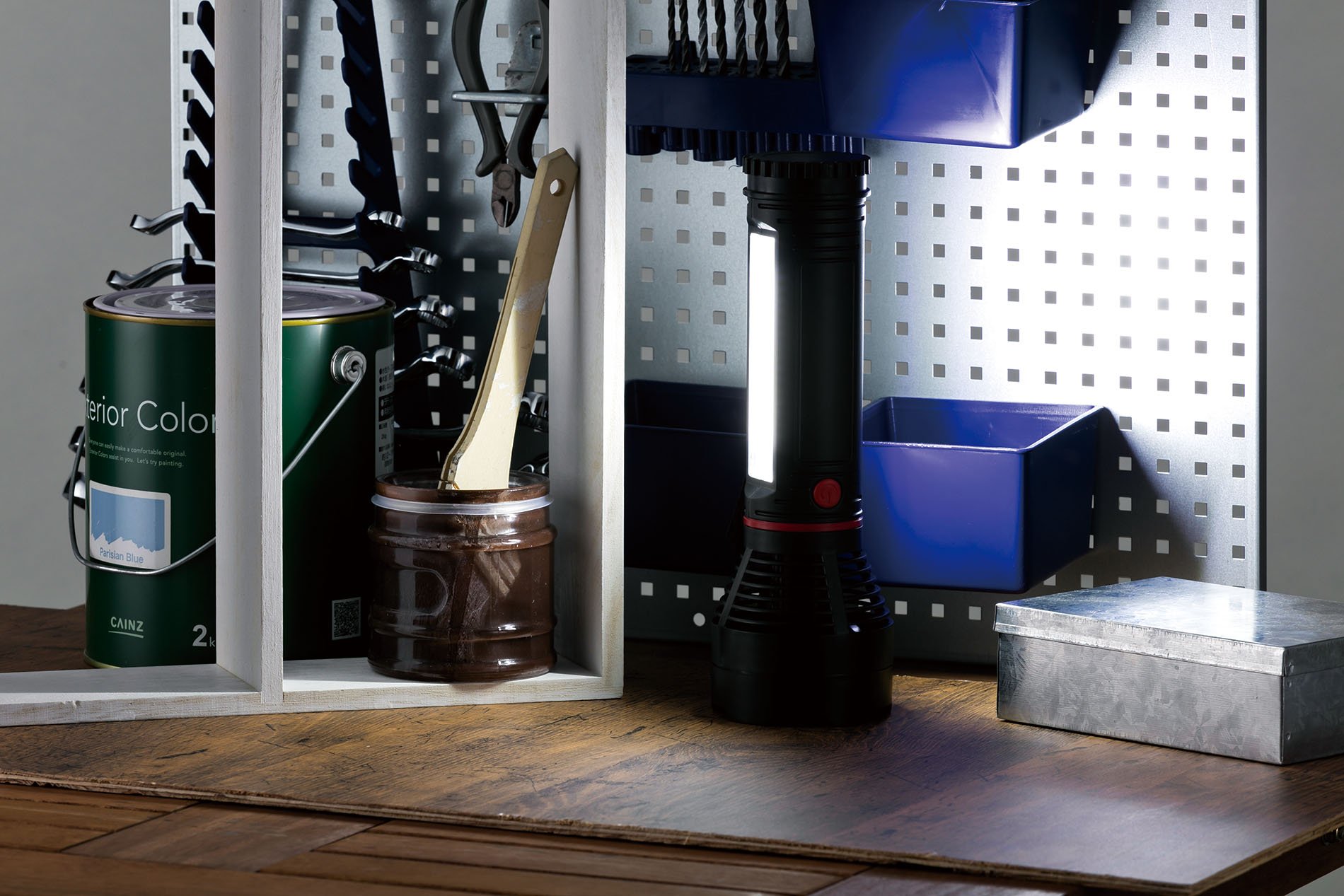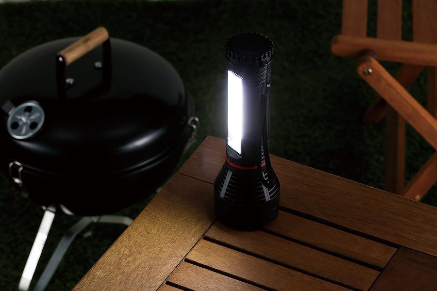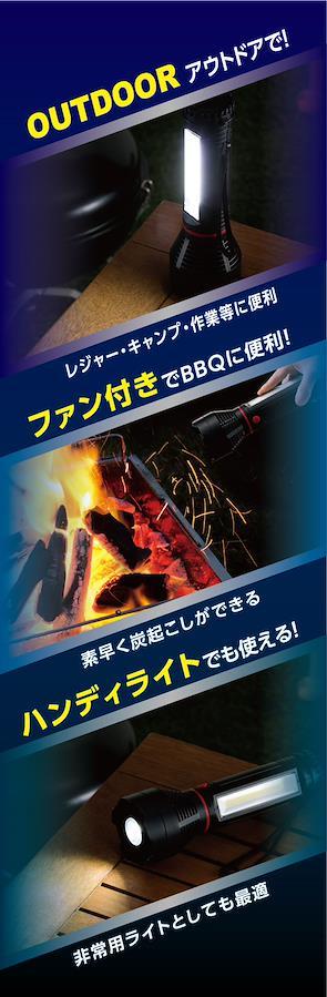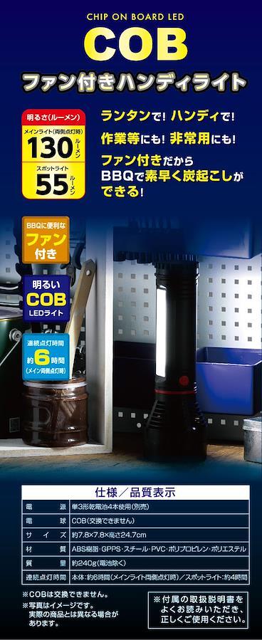 ランタンにも! ハンディライトとしても! 作業・非常用にもどちらにも使える便利なライト!ファン付きだからBBQなどの火起こしも素早くできる!明るさ:メインライト130ルーメン・スポットライト55ルーメン単3電池4本使用(別売り)COB(交換できません)サイズ:7.8×7.8×高さ24.7cm材質:ABS樹脂・GPPS・スチール・PVC・ポリプロピレン・ポリエステル連続点灯時間/本体:約6時間(メインライト両側点灯時間)/スポットライト:約4時間-