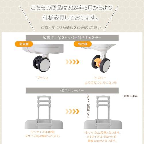 【商品仕様】※S size:外寸:約55×40×20cm 内寸:約45×38×20cm 本体重量:約2.87KG 、1~3泊に似合い。Sサイズは機内持込が可能なスーツケースです。飛行機内だけでなく、一人旅行や故郷帰りの新幹線やバスなどの車内移動も便利なスーツケースです。※M size:外寸:68×43×24.5cm 内寸:約60×40×24.5cm 本体重量:約3.9KG、4-7泊以上 。※L size:外寸:約77×49×29cm 内寸:約68×47×29cm 本体重量:約4.5KG、7泊以上。 【新登場・高品質】スースケースのボディはABS樹脂で作られ、耐衝撃性に優れています。蜂の巣状のスクラッチ防止パターンを採用しているため、本来立体的なデザインに立体感を持たせるとともに、ボディーのスクラッチ防止特性を向上させています。美観と実用性を併せ持ち、バッグの耐摩耗性がより向上され、もっと頑丈になります。 【フック機能搭載・収納力もプラス 】滑りにくいソフトハンドルで長い時間の手提げでも手は疲れません。隠しフックが搭載されており、バッグなどを掛けて、旅行中の手への負担を軽減してくるスーツケース。また、仕切りと複数のポケットで整理整頓がしやすい内装レイアウト。たくさんの小物を入れることはできます。X型ベルトが完備され、荷物崩れを完全防止。 【多段調節キャリバー】スーツケースのキャリバーはアルミ素材を採用しています。アルミ材質は丈夫で軽量な特徴があり、通常のスーツケースと比べて耐久性が向上し、見た目もも美しくなっています。男女問わず、ビジネスでの出張でもプライベートなご旅行でもシーンを選ばずに使用できます。 【頑丈な静音ダブルキャスター】360°独立に回転できるダブルキャスターが搭載し、海外に多い石畳やレンガ道でも滑らかに動かすことができます。8つの車輪に荷重が分散されるため耐久性にもすぐれています。また、 ストッパー機能を備えたデザイン、電車の中や坂道でも勝手に動く心配がなく安心です。旅行者の負担を軽減します。