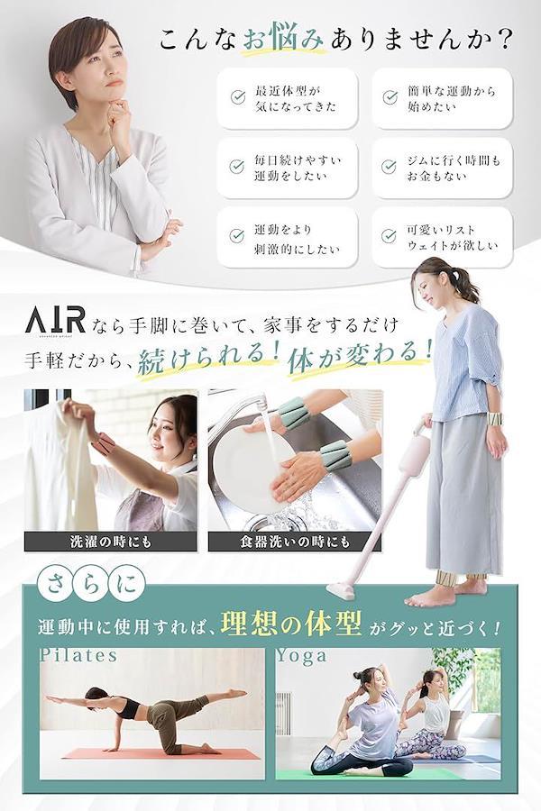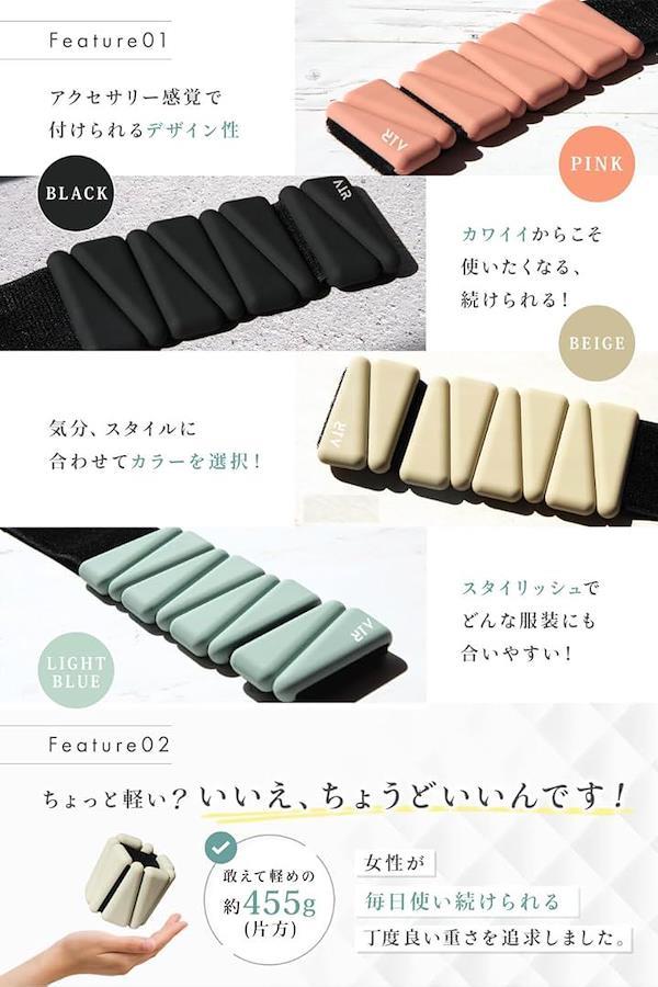 AIRは、女性が「毎日使い続けられる重量」を追い求めた結果、両側で約910gとリストウェイト・アンクルウェイトの中では、軽量の設定となっております。