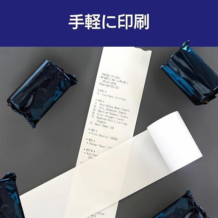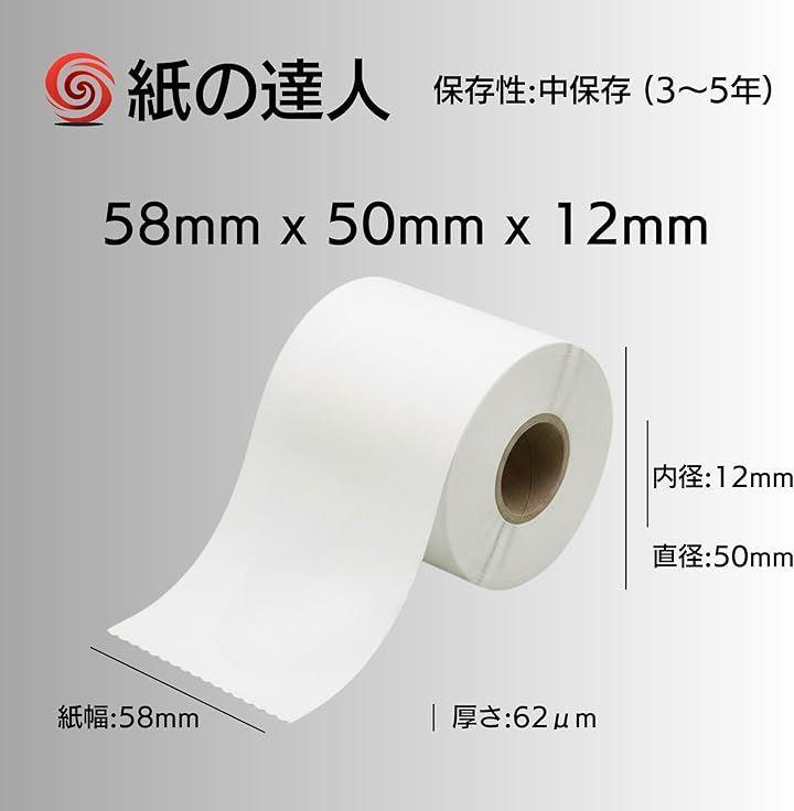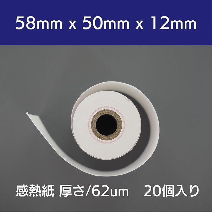 用紙サイズ:58mm x 50mm x 12mm 紙の厚さ:62ミクロン 長さ:28.46m