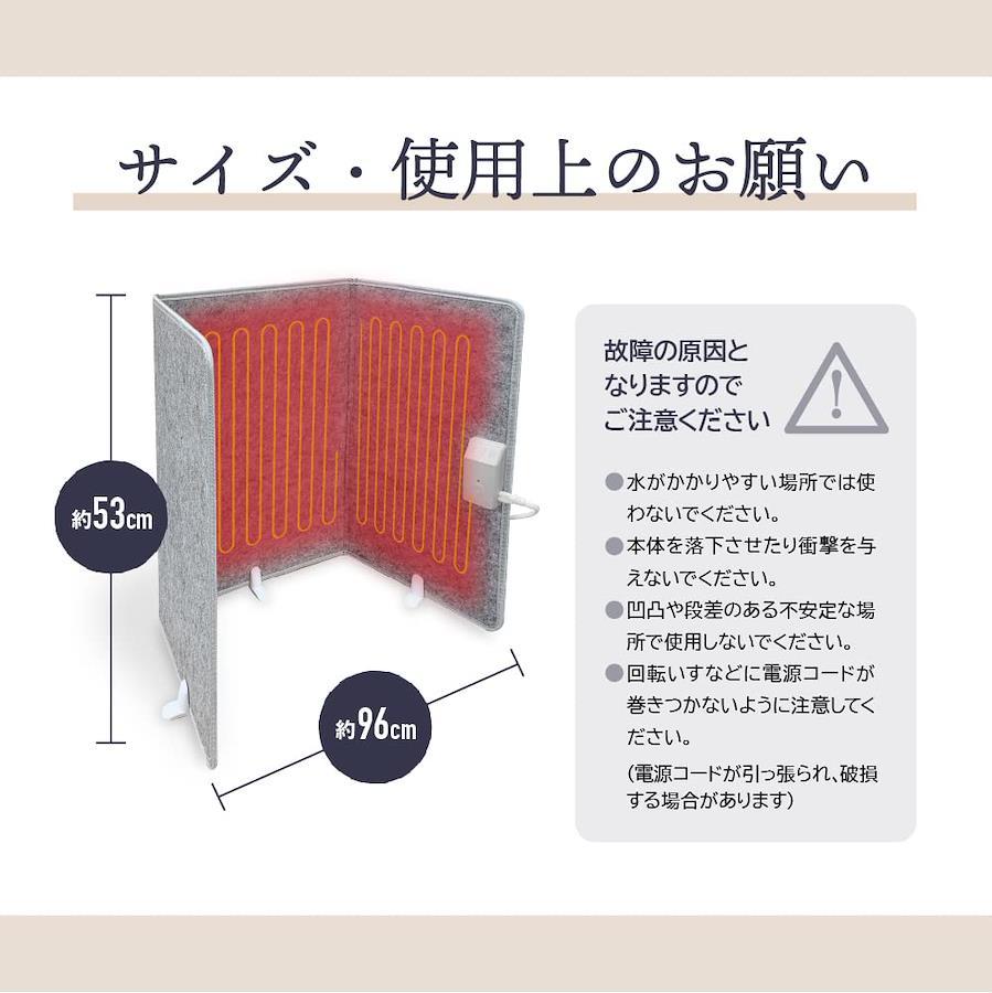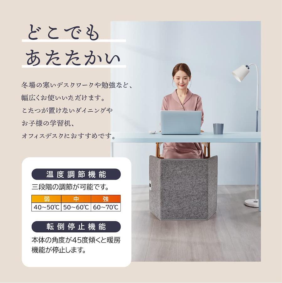 POINT 1遠赤外線使用内側全面に遠赤外線パネルを採用し、広い範囲で効率よく温める。火を使わず、温めるのでペットや赤ちゃんにも安心して使える。POINT 2速暖最短1分で速暖!優しく足元を温める。背面に置いて背中もぽかぽか気持ちいい付属のブランケットを使用することで保温効果UP!