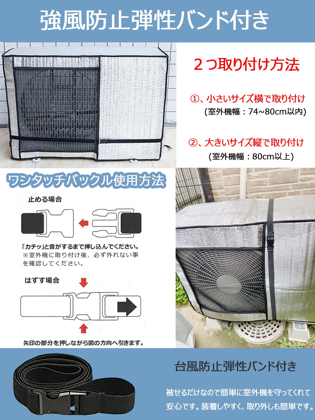 3営業日以内に発送≪新品未開封品≫:【室外機カバー仕様】:展開サイズ: 74x54x26cm (1枚)、固定用ベルト:1本。材質:両面は厚いレーザーアルミ箔、内部は複合綿、底部は防水性のPVCアルミを使用しています。最新光反射素材を使用し、室外機 を遮光し、外気温による室外機の温度上昇を防止する事でエアコンを効率的にご利用いただけます。 直射日光を避け、室外機の傷みを防ぎます。撥水加工もされており、雨天でも快適に過ごせます。 吹き出しのところ、背面はメッシュ素材でできているので、通気性にも優れています。【節電・省エネでき】余計な温度上昇をカンタンに抑える可能で、省エネ最新設計のエアコン室外機カバーは、厚みのある構造でしっかり断熱直射日光を遮り、廃熱効果が高まりますので節電・省エネ対策になります。冷却効果が上がることで、室内温度の冷却スピードも短縮でき、電気料金の節電効果も得られます。【固定用ベルト付き】被せるだけなので簡単に室外機カバーを装着でき、カバー下部に固定用紐があって縛ることによって取付固定されます。全体固定用のベルトも付き大雨や台風などの悪天気時飛散の心配がありません。また使用しない時にはコンパクトに収納で