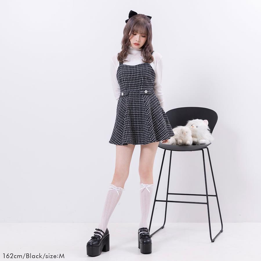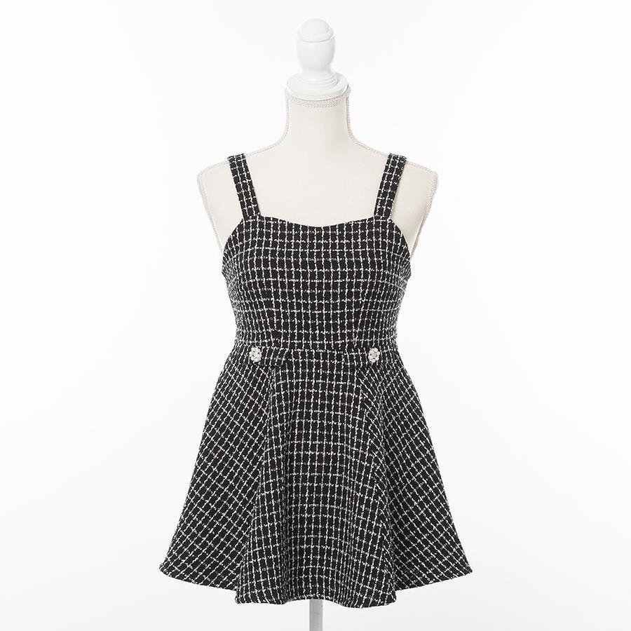 ビジューボタンがアクセント、シンプルツイードジャンスカのご紹介。【デザイン】シンプルなミニ丈ジャンスカです。肩のベルトは後ろで長さ調節が可能です。背中のジップファスナーで着脱です。引手がハートチャームなところがちょっぴりかわいいポイント♪ウエストの飾りフラップにビジューボタンがちょこんとついています。※ポケットはありません。【素材】ちくちく感のない、程よい厚みのツイード素材です。裏地もついていて、透け感なく着ていただけます。【コーディネート】王道ブラウスを合わせるとフレンチがーリーに。襟付きブラウスを合わせると上品な量産型コーデにも合わせていただくことができます♪シンプルなデザインなので、色々なトップスと合わせていただきやすい、万能ジャンスカです。《透け感》なし 《生地の厚さ》普通 《裏地》あり 《伸縮性》なし《生産国》中国