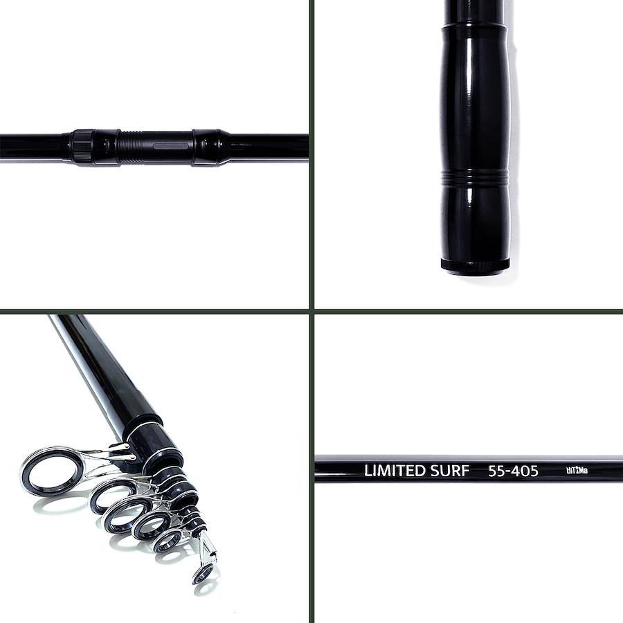 UlTiMa(アルテマ)より4.05m、最大オモリ負荷55号の大物投げ釣り用振出投げ竿です。 大物投げ釣りをカバーするガイドセッティングや継口のアルミリング補強、また高密度カーボン採用の高反発なカーボンブランクスであらゆる大物をいなすサーフキャスティングロッド。ガイドは収納便利な折りたたみ式でありながら飛距離を伸ばす事を考えた背の高いタイプを採用。SIC使用なのでPEにも対応。さらに全体が大口径ガイドにより極太道糸でも抵抗が少なく飛距離が伸びます。加えてリアグリップは剛性を考えたメタルデザインとなっております。 強力なバットパワー。 仕舞寸法約123.5cmで持ち運びに便利!《LIMITED SURF 55-405 仕様》 素材:カーボン|全長:約4.05m|仕舞寸法:約123.5cm|自重:約583g|継数:4本、振出|錘:90~207g|先径:約4mm|元径:約26.5mm|ガイド数:6個|トップガイド内径:8mm|バットガイド内径:23mm|折りたたみ式バットガイト(SiC仕様のガイド。PE、ソルト対応)|リールシート上端から竿尻までの長さ:約91cm|大型リールシート、スピニングリール用|竿袋付き※ 製造上、塗装のムラ、エポキシの気泡やその他線傷、輸送上の擦れなどがある場合がございます。また、デザインは予告なく変更になる場合がございます。予めご了承ください。