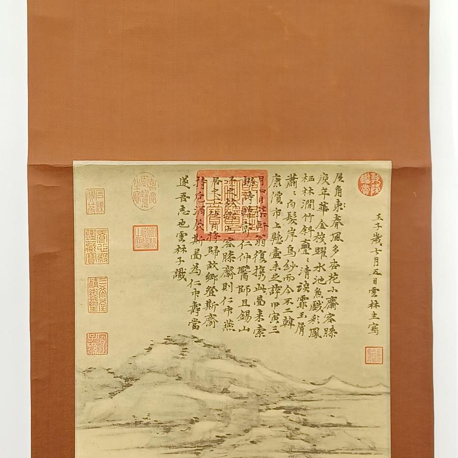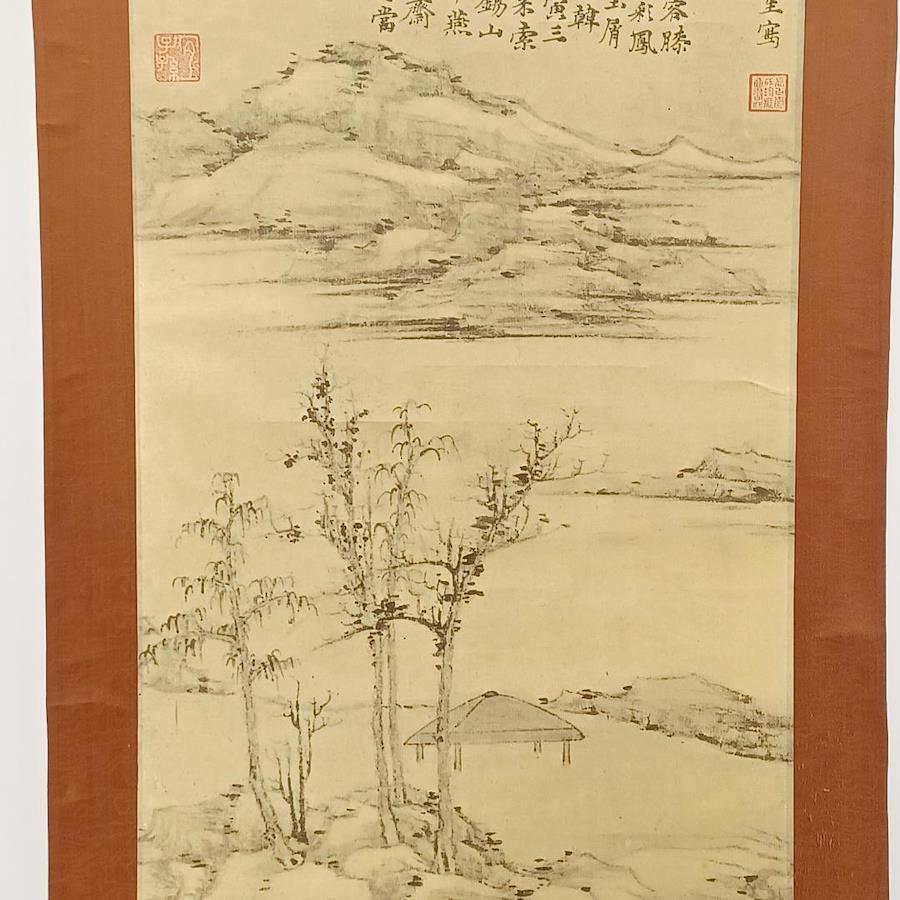 This is a beautiful used Japanese hanging scroll, known as a "Kakemono." It features a serene ink painting of a forest and clouds, created with a traditional Japanese Sumi-e technique. The subtle use of ink and brushwork captures the tranquil beauty and peaceful harmony of Japanese nature.