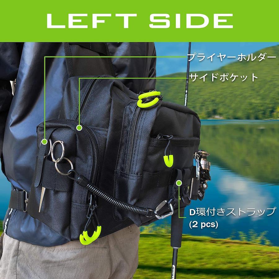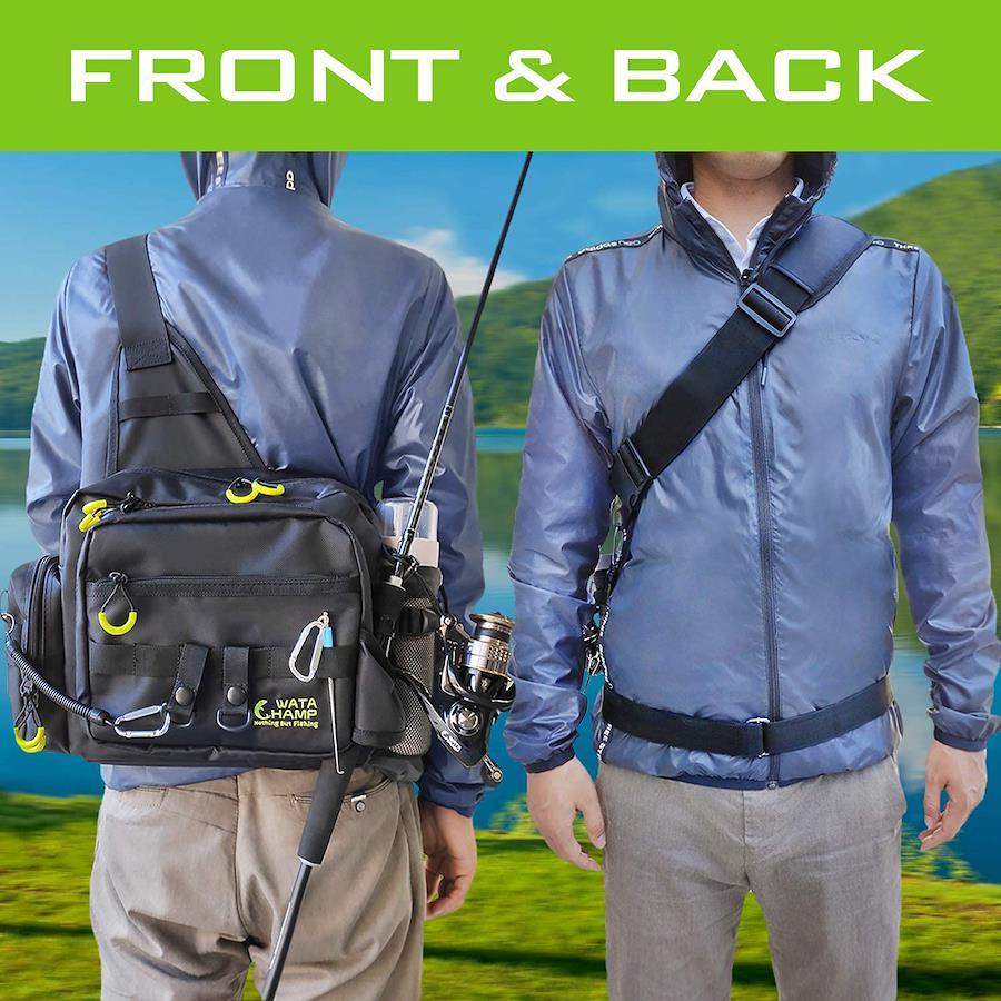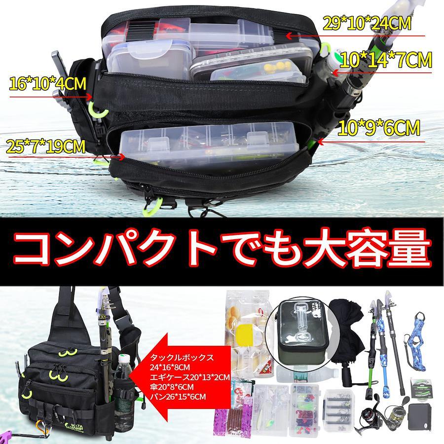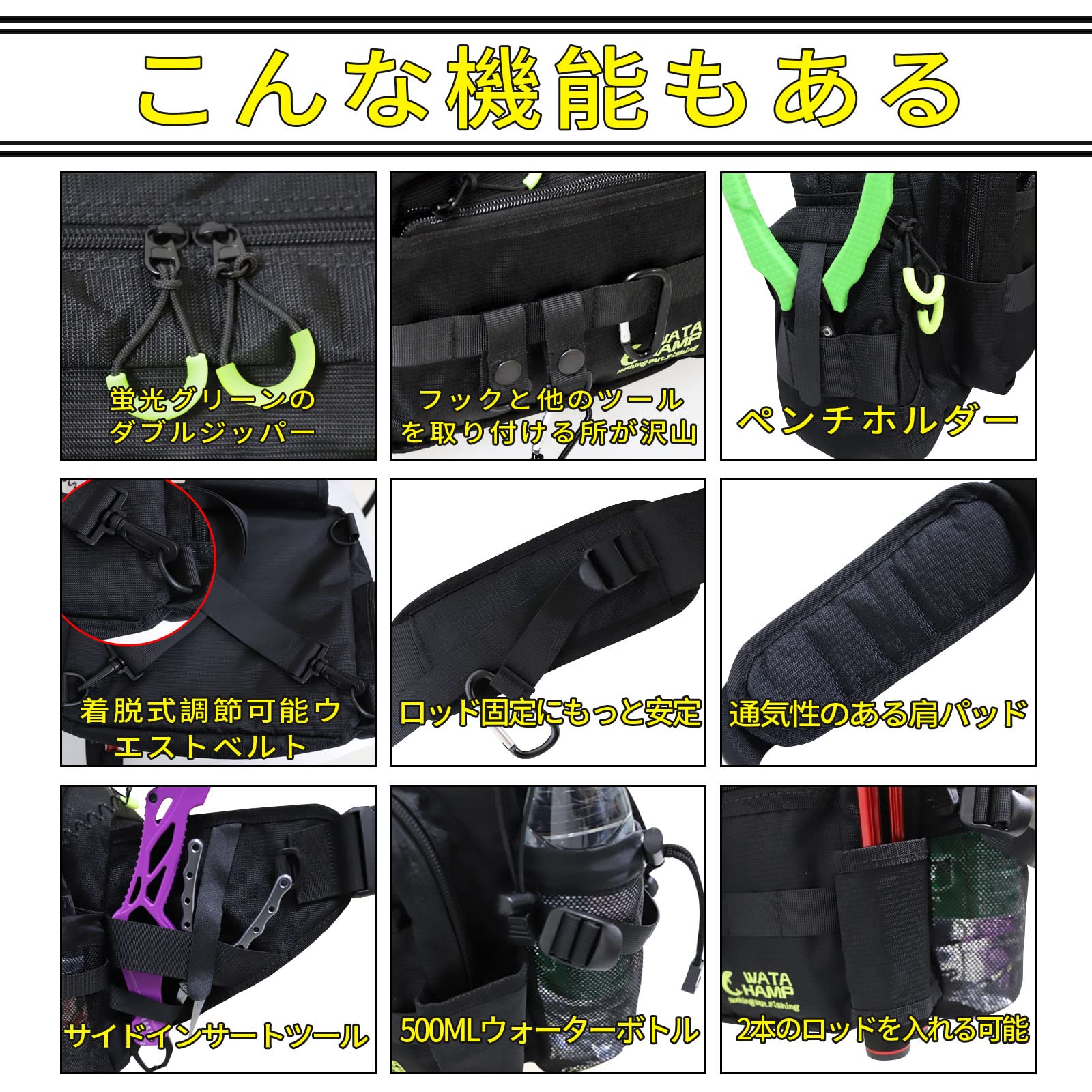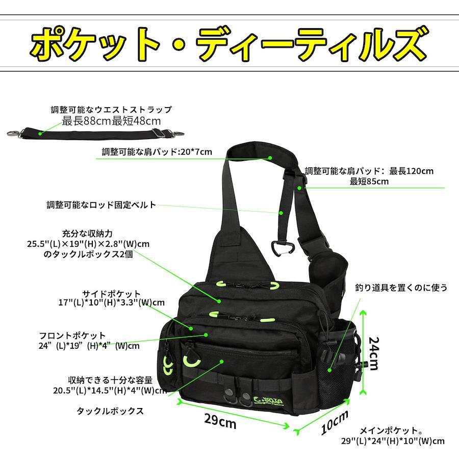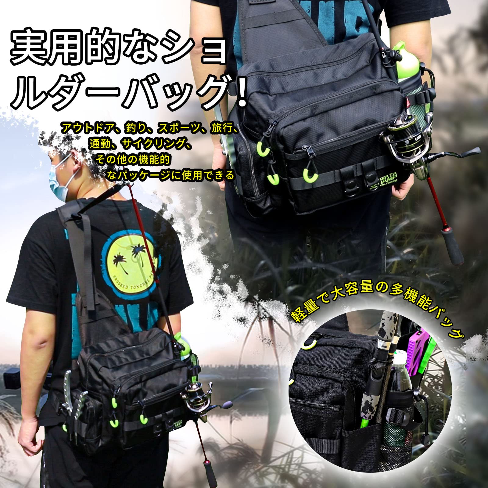 7L大容量釣り ショルダーバッグ:【自重】530g 【メインポケット】幅29cm x 縦10cm x 高24cm 【中ポケット】幅25cm x 縦7cm x 高19cm【前ポケット】22cm*13cm*2cm 【サイドポケット】15cm *10cm *5 cm 【カップバッグ】17cm *10cm *6cm # カップバッグは巾着仕様で自由に調節可能【マルチポケット&大容量】収納力は結構ありルアーやエギのケース、簡単な仕掛けなど、ランガンするなら十分な収納力があります。ドリンクホルダーもペットボトルなら入ります。プライヤーやフイッシュトングなどもカラビナなどでぶら下げられます。ロッドホルダーは自分はルアーチェンジの時にロッドホルダーに刺して使って、背中にフォームを内蔵し、背負ったままでも快適な釣ります。?1000D耐久性の防水素材:WataChamp釣り用タックルバッグは1000デニールの平織りポリエステル生地を縫製し、素材の裏側はPVCでコーティングされて、より耐摩耗性、撥水性と防水性を向上します。すべてのコンパートメントには独立した防水機能があります。バッグの裏側は一日中ハードな
